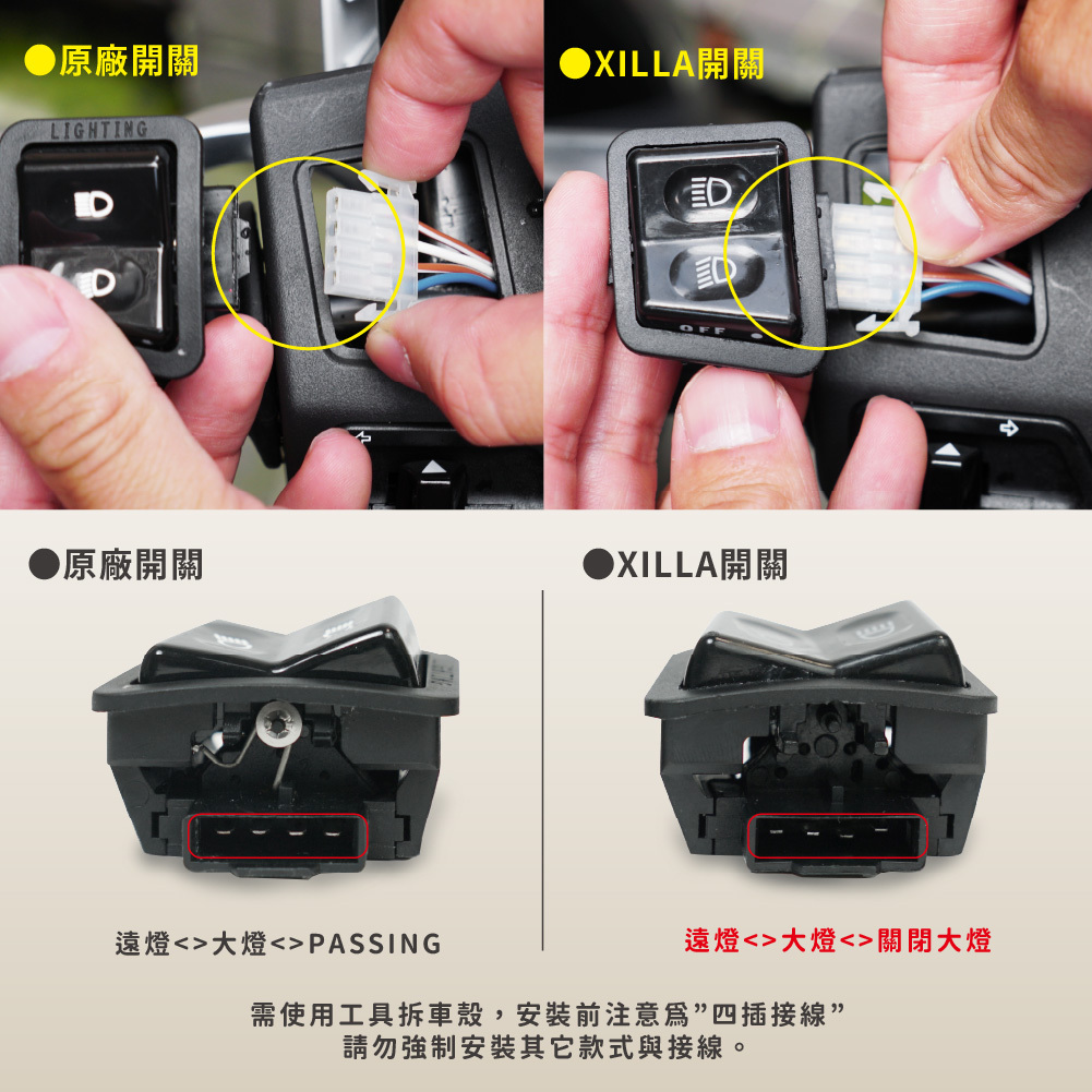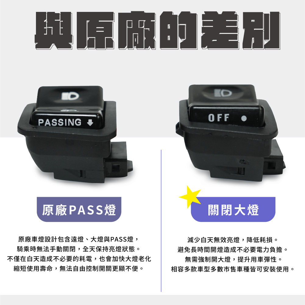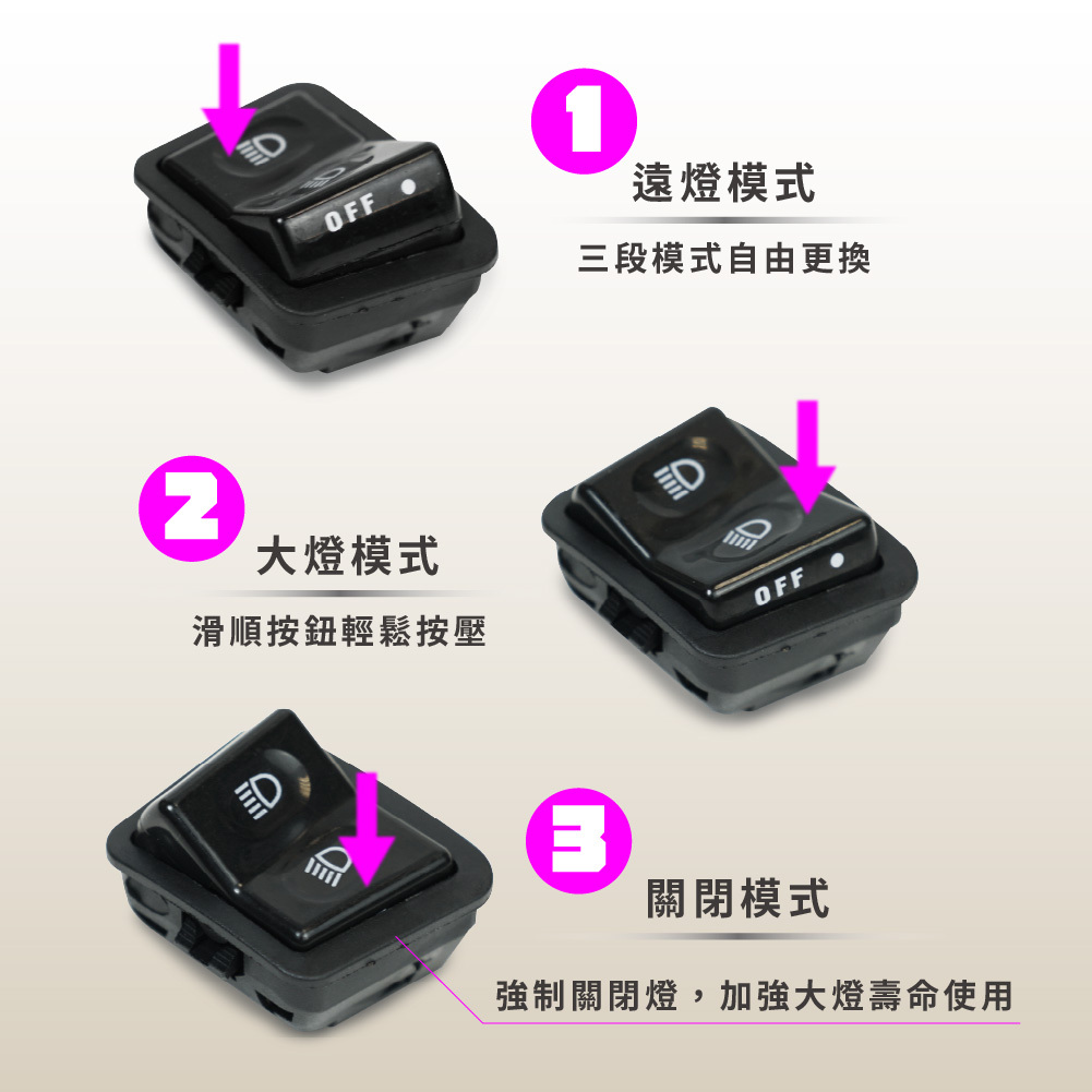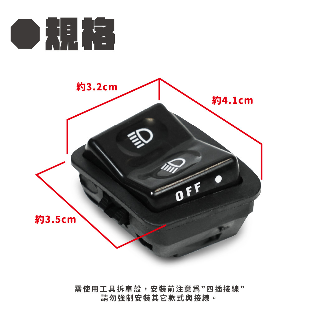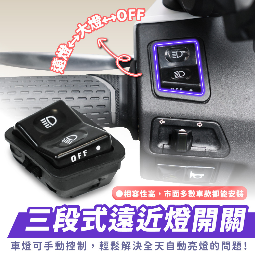 三段式遠近燈開關,採用4PIN接口設計,適用多款車型電系改裝與維修。操作靈活簡便,可快速切換遠燈、近燈及關閉狀態,提升安全性。