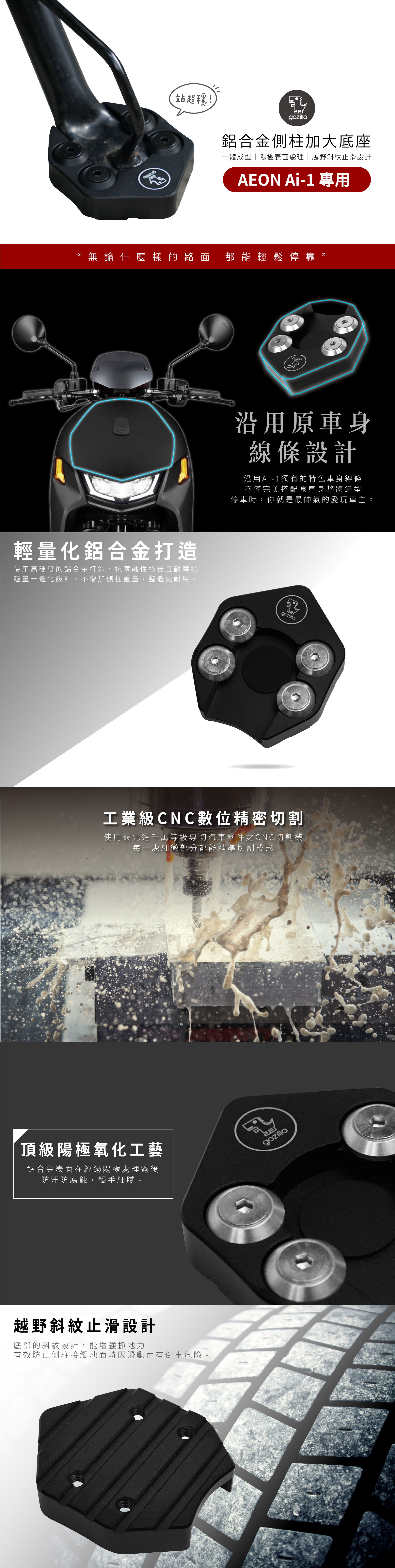AEON Ai-1/Ai-3 鋁合金側柱加大底座,專為提升車輛穩定性與支撐力而設計。此加大底座採用高強度鋁合金材質,具有輕量化與耐用性,能有效增強車輛側柱的穩定性,防止側柱變形或損壞,提升整體車輛的使用壽命。加大設計可提供更好的支撐力,確保車主在日常駕駛及停車過程中更加安全穩定。安裝簡便,完美貼合AEON Ai-1/Ai-3,無需改裝即可輕鬆升級,讓車主在享受騎行的同時,也能提升車輛的耐用度與性能。
