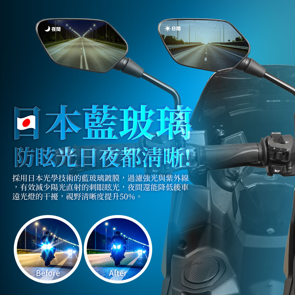採用日本光學技術的藍玻璃鍍膜,過濾強光與紫外線,有效減少陽光直射的刺眼眩光,夜間還能降低後車遠光燈的干擾,視野清晰度提升50%。