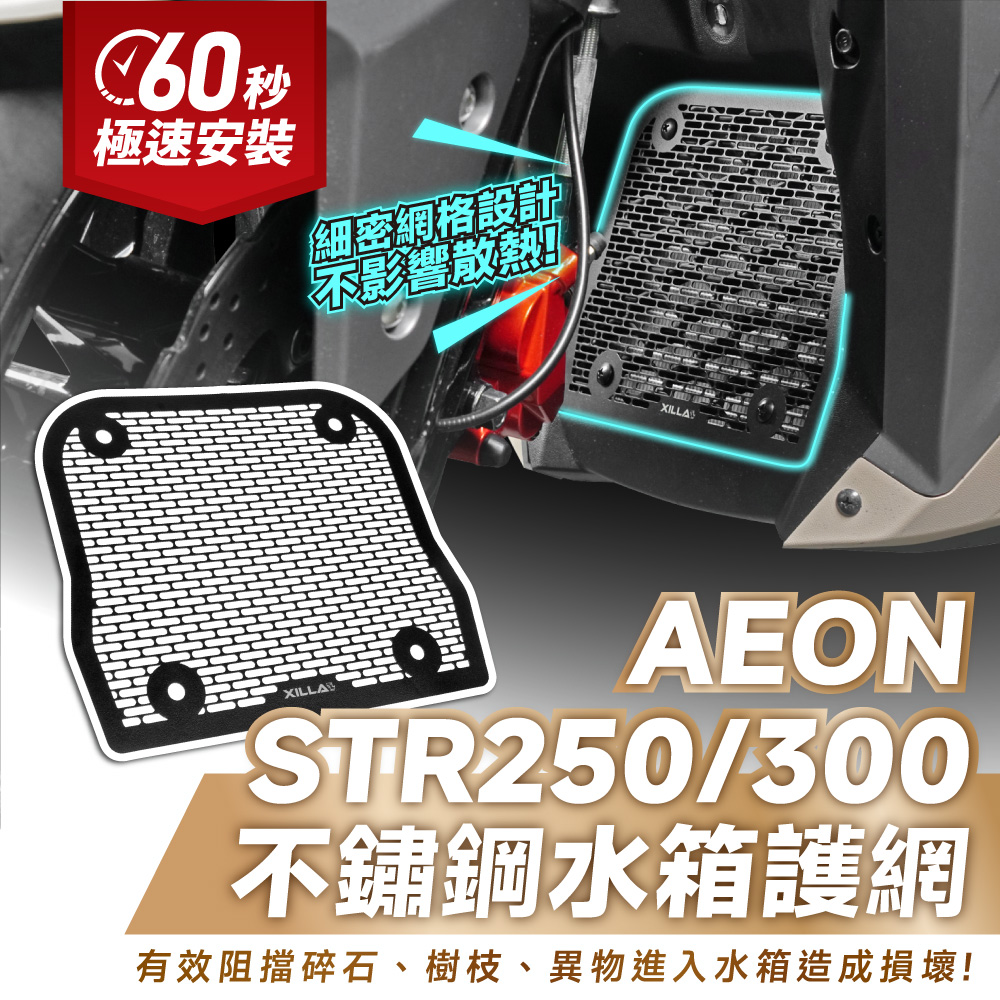 專為 AEON STR 250 / STR 300 設計的不鏽鋼水箱護網,有效防止碎石、蚊蟲與異物損壞水箱核心,提升騎乘耐用性與整體質感。