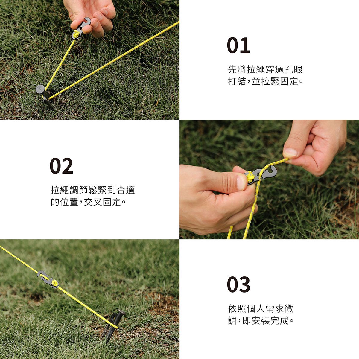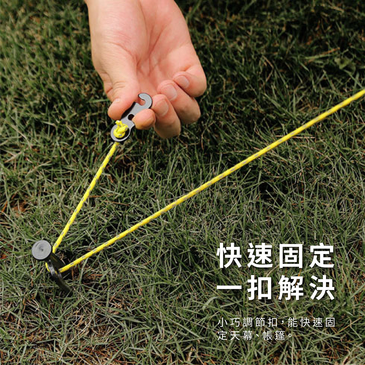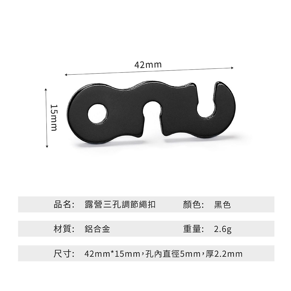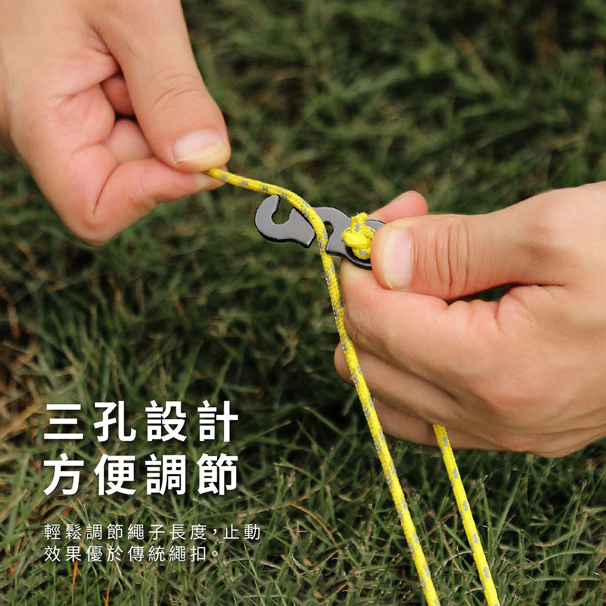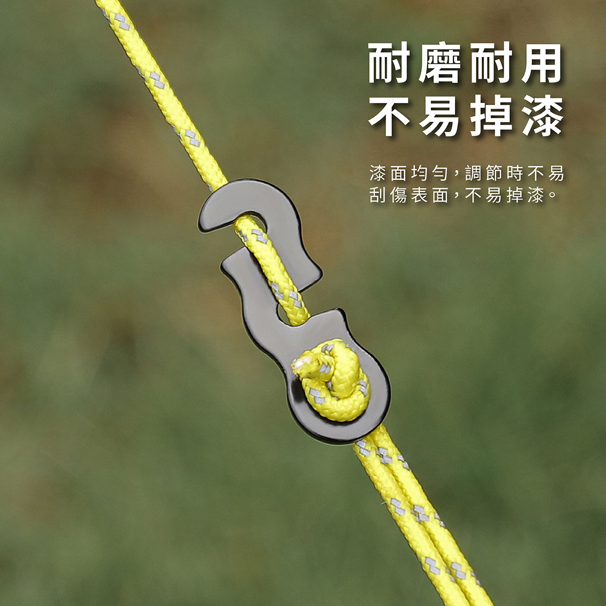 露營三孔調節繩扣採用高強度鋁合金材質,具備高硬度與輕巧重量,專為戶外露營設計。其三孔設計讓您輕鬆調節繩索長度,快速固定天幕、帳篷等設備。漆面均勻,耐磨耐用,不易掉漆,長時間使用依然保持良好狀態。這款調節繩扣是露營、登山等戶外活動的必備配件,提升裝備固定效率,簡化設置過程。