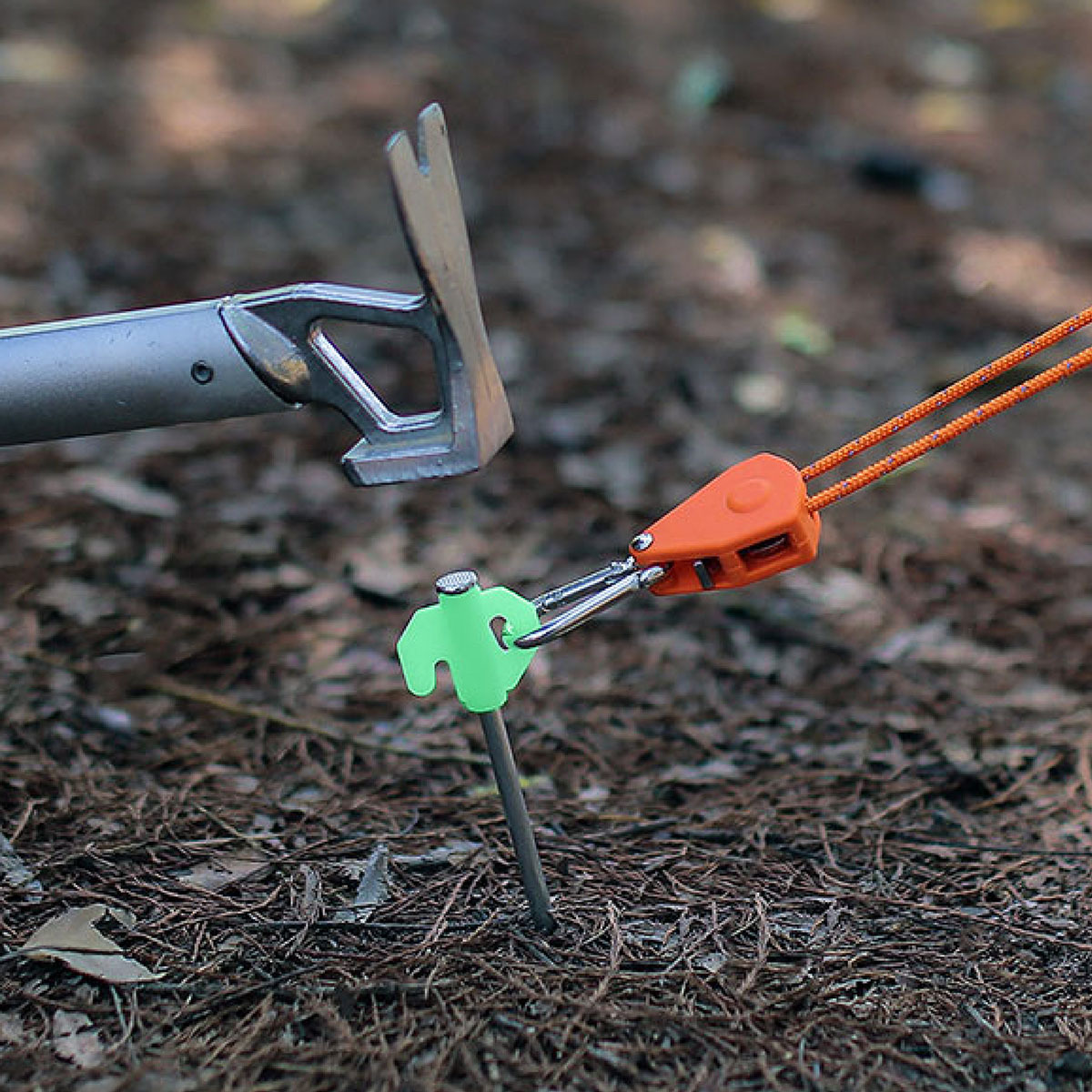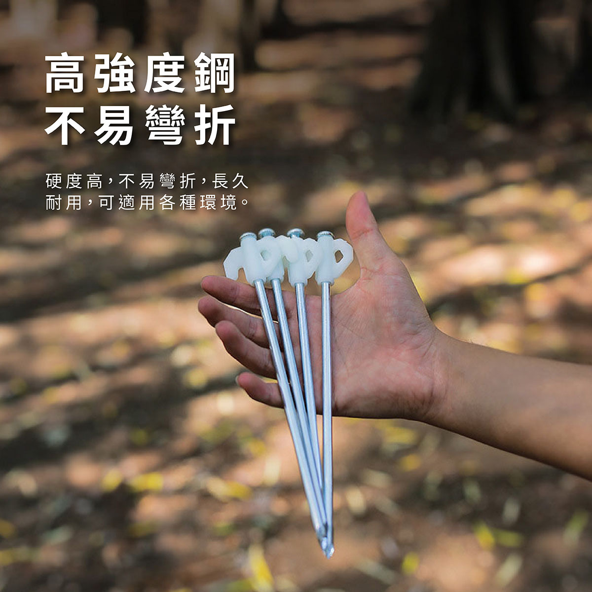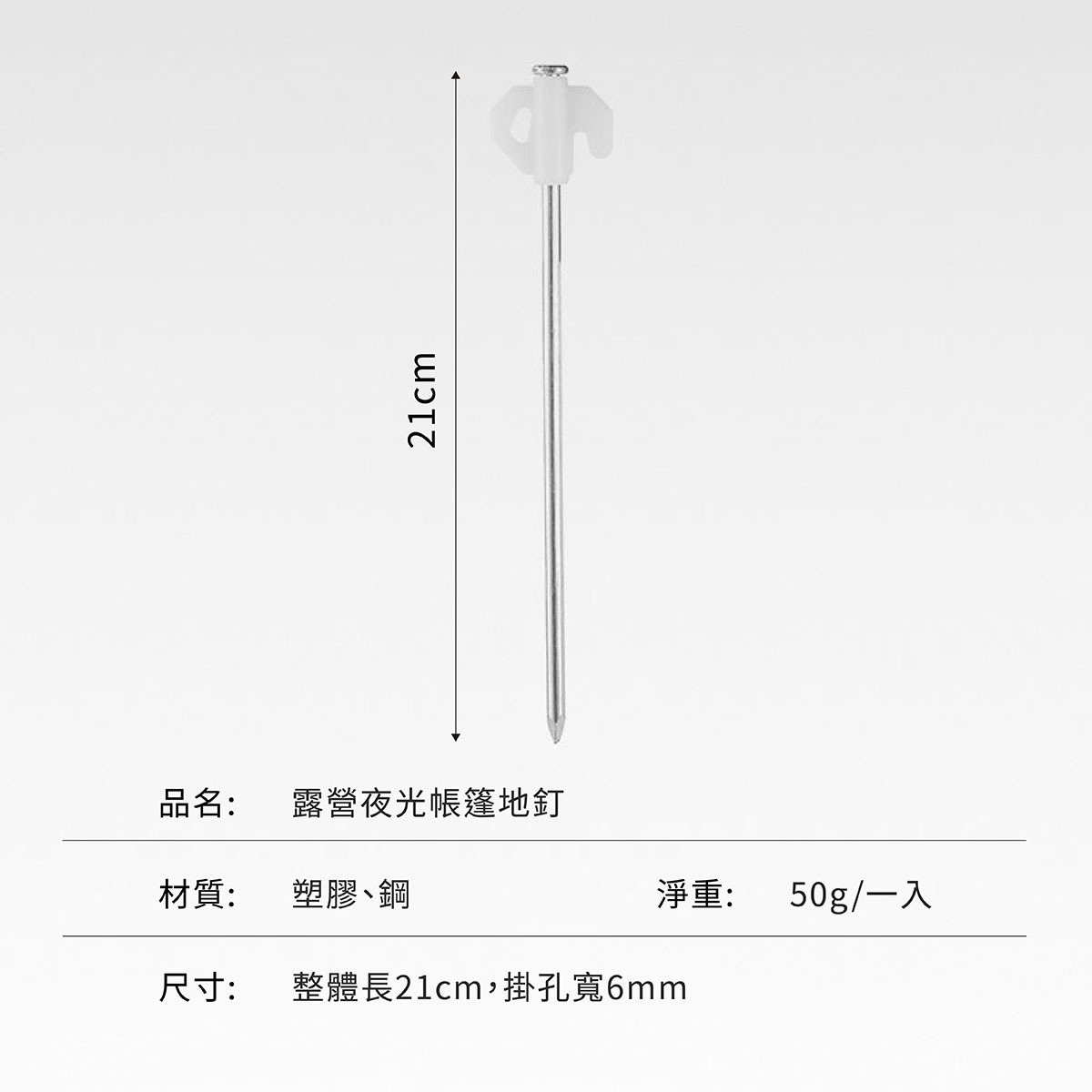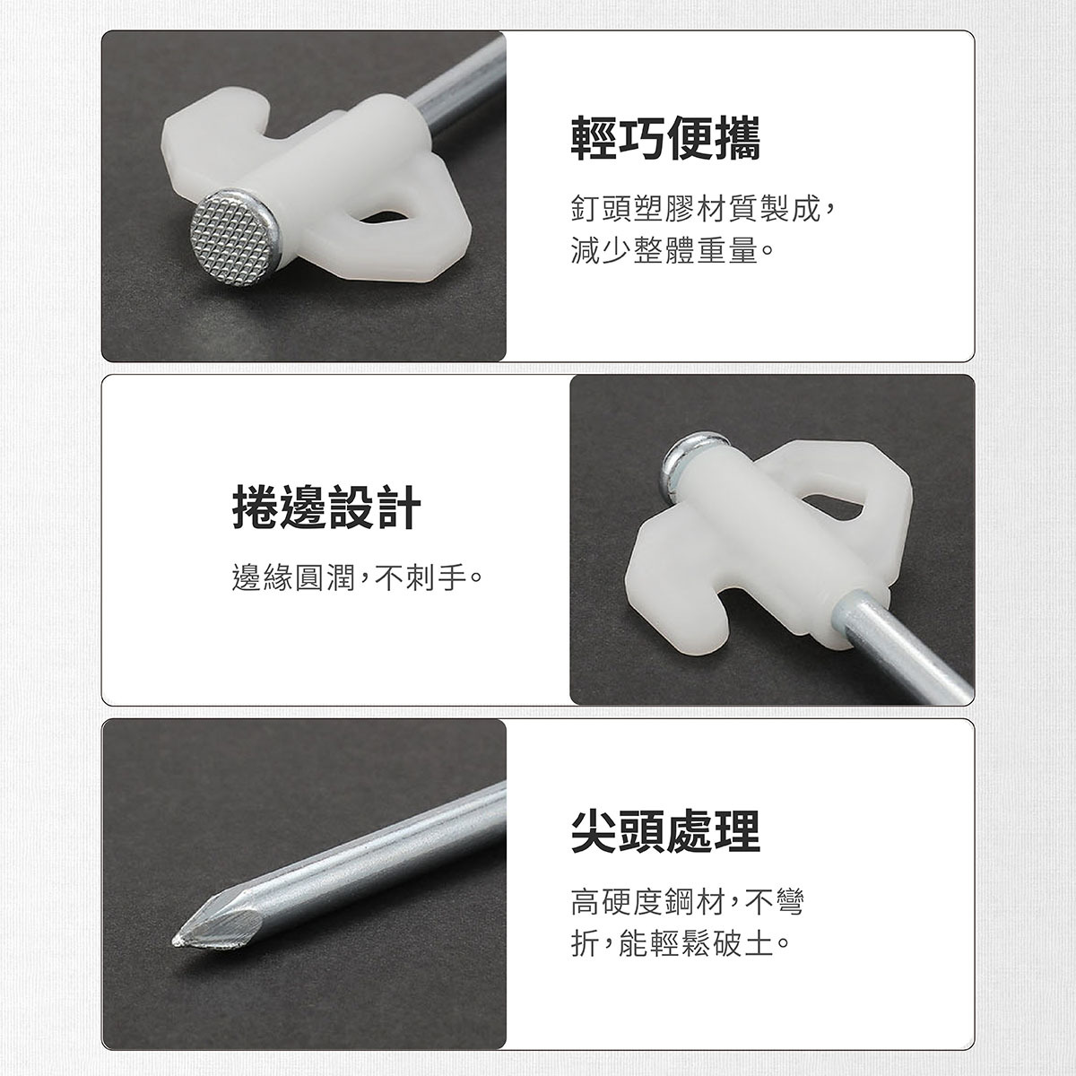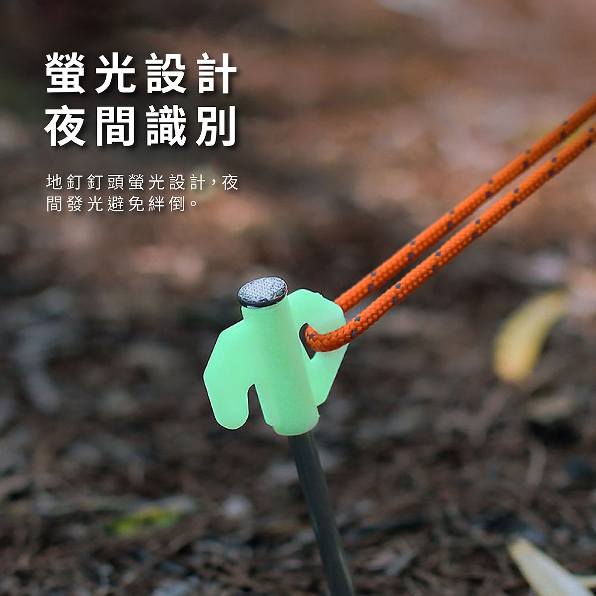 露營夜光帳篷地釘設計有螢光釘頭,夜間可發光,有效避免絆倒或遺失。採用高硬度塑膠和鋼材質,堅固耐用,不易彎折,適合各種戶外環境。可使用防脫鉤或掛孔固定方式,確保穩固固定帳篷。輕巧設計便於攜帶,是露營、登山等戶外活動的必備配件,提升帳篷穩定性和安全性。