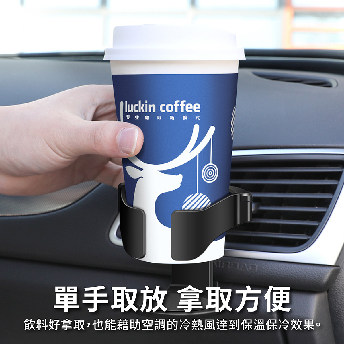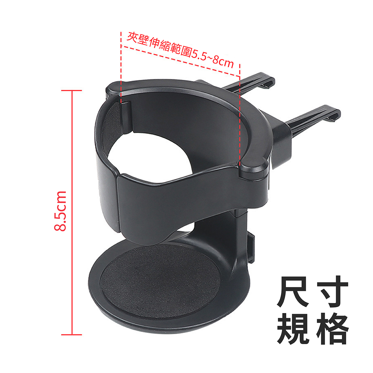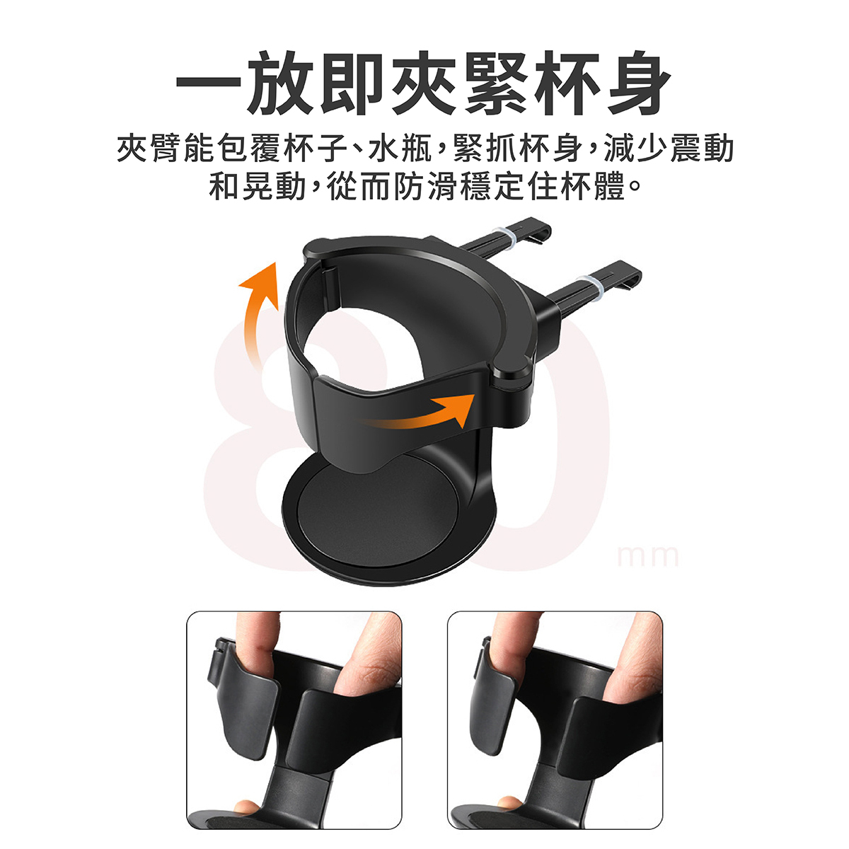 汽車出風口飲料架,小巧輕盈設計,不佔空間,輕鬆安裝於出風口,穩固固定飲料瓶、防止翻倒。彈力夾臂搭配三組長度勾夾,可適應不同出風口葉片,減震防滑海綿墊有效防止撞擊異響,提升行車舒適度。支援直徑80mm內的水瓶、飲料罐等,單手即可快速取放,讓行車過程更加便利,是車內飲品收納的理想選擇。