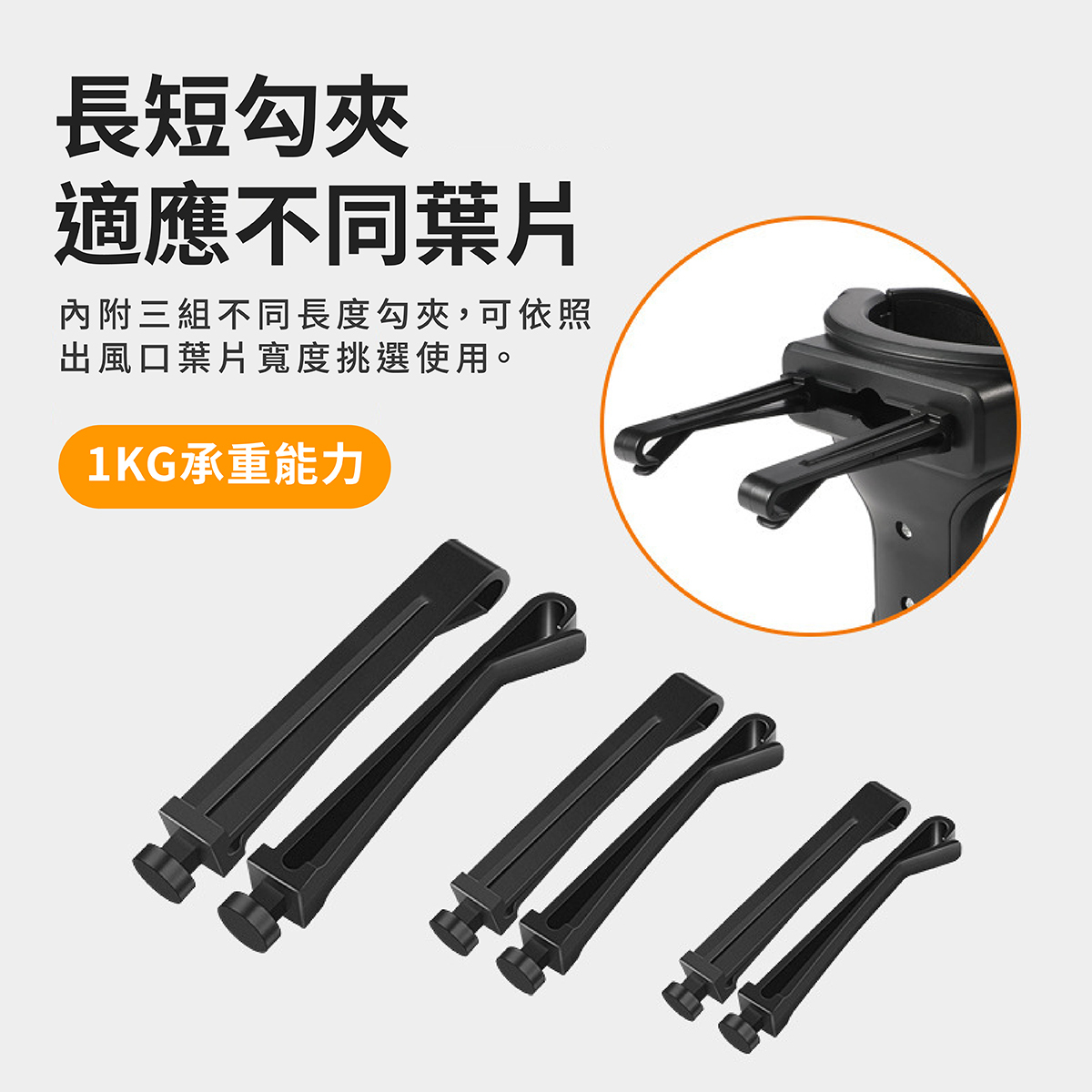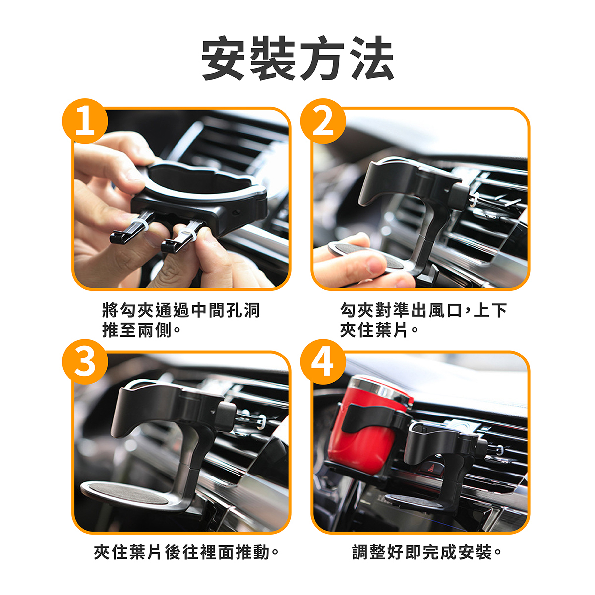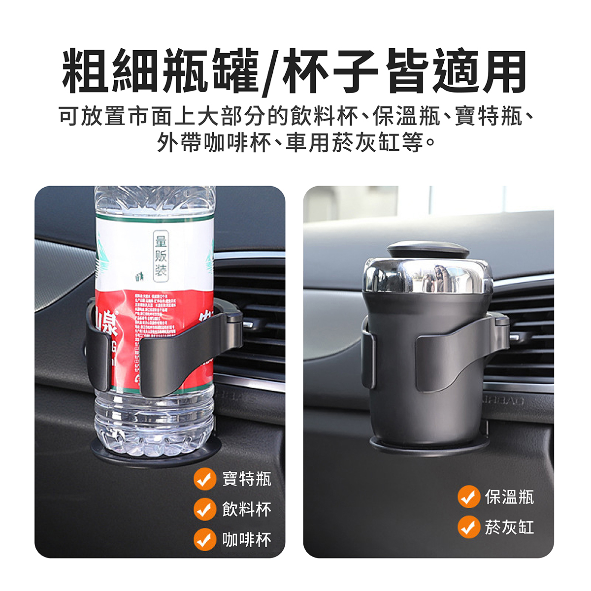 汽車出風口飲料架,小巧輕盈設計,不佔空間,輕鬆安裝於出風口,穩固固定飲料瓶、防止翻倒。彈力夾臂搭配三組長度勾夾,可適應不同出風口葉片,減震防滑海綿墊有效防止撞擊異響,提升行車舒適度。支援直徑80mm內的水瓶、飲料罐等,單手即可快速取放,讓行車過程更加便利,是車內飲品收納的理想選擇。