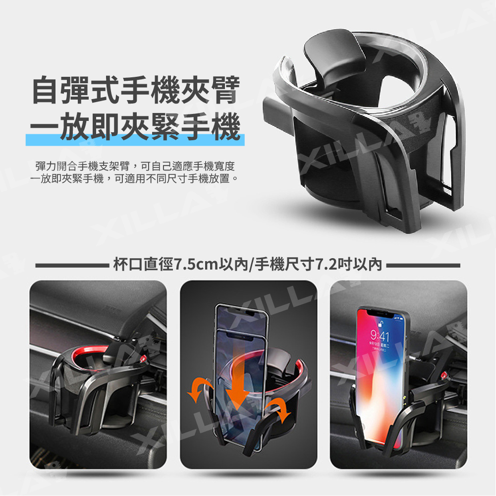汽車出風口手機杯架,專為車內便利設計,讓您的手機與飲料可同時擺放,提升行車便利性。適用於橫向與直向出風口,並附有兩種掛勾,可兼容多種車款。具備可調節杯底平衡設計,即使車輛行駛中也能保持穩定。自夾式手機夾臂設計,單手操作更方便,適應各種手機尺寸。嚴選ABS材質製作,堅固耐用,不易變形,讓您輕鬆享受行車中的便利與安全。