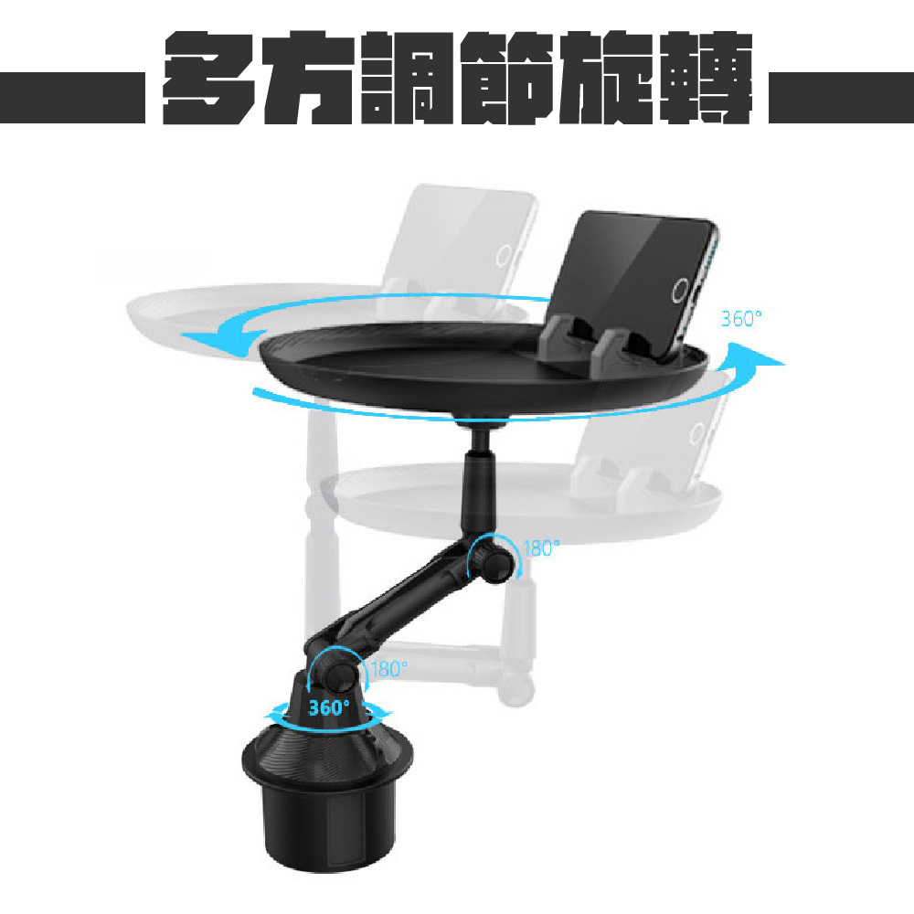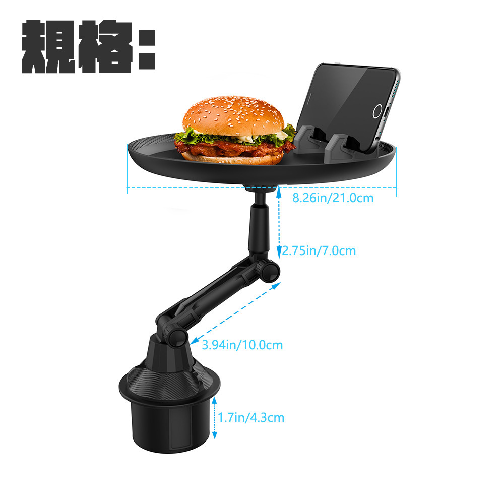 汽車圓形杯座餐飲盤,專為車內用餐與收納設計,穩固耐用,確保餐點不再東倒西歪。具備旋轉升降功能,可根據需求調整高度與角度,提升車內空間利用率。獨特雙用設計,可作為手機架使用,讓您邊用餐邊追劇或導航更方便。適用於大多數車內圓形杯座,安裝簡單,不影響原車內裝,是長途旅行、日常用餐的實用車內小桌板,提升駕駛與乘客的舒適體驗。