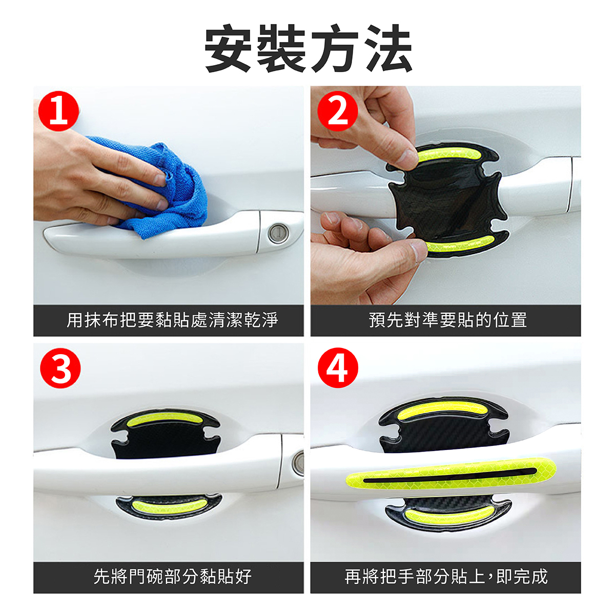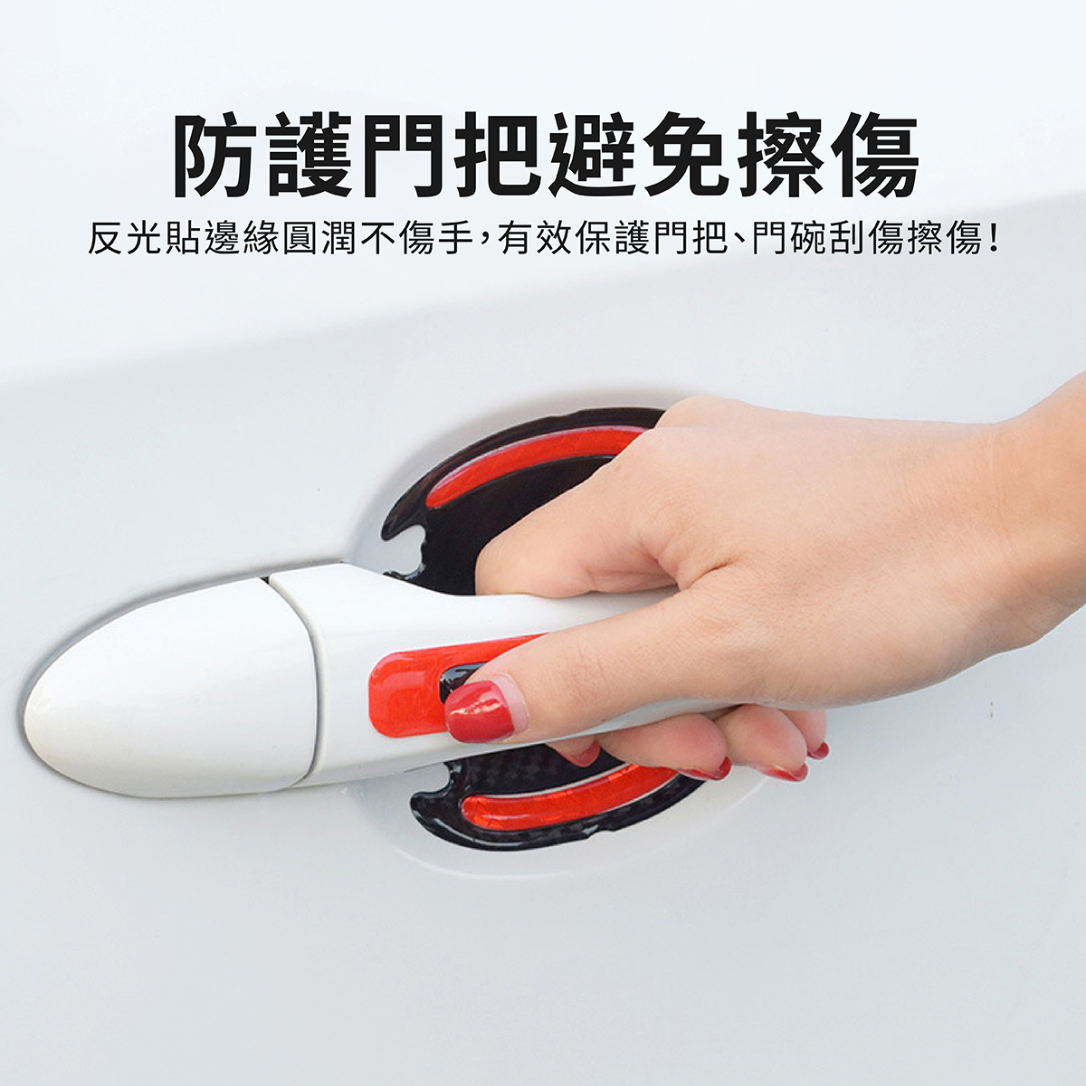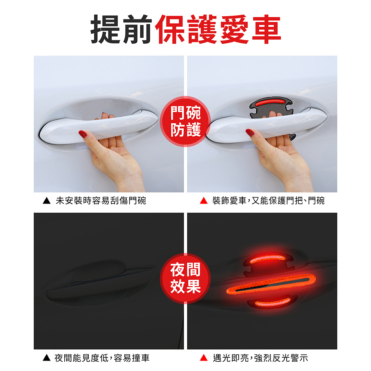 汽車門把防刮警示貼採用全稜鏡反光技術,夜間遇光即強烈反射,提升行車安全性,有效減少碰撞事故。白天可作為車身點綴,增添愛車質感,夜間則提供高亮警示效果。貼片使用EGP材質製成,耐候性強,不易脫落,可貼合車門把手及門碗弧度,防止刮傷、碰撞,安裝簡便,無需工具即可完成。提供白色、黃色、紅色及螢光綠四種顏色選擇,滿足不同車款風格需求,讓您的愛車兼具安全與美觀。