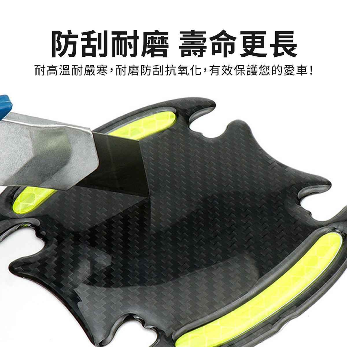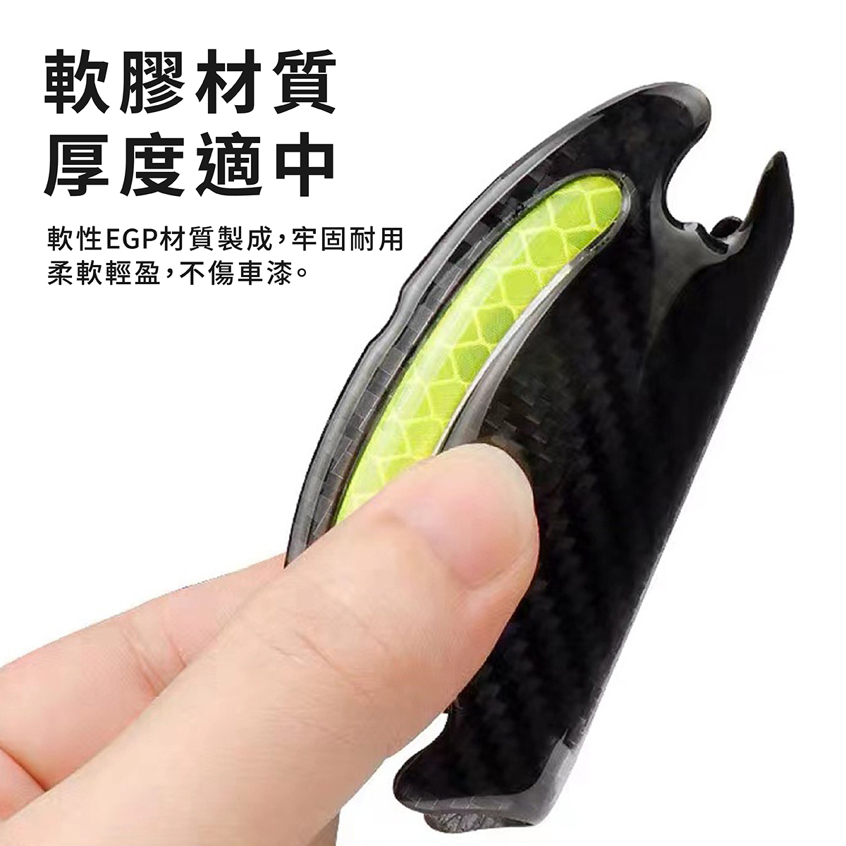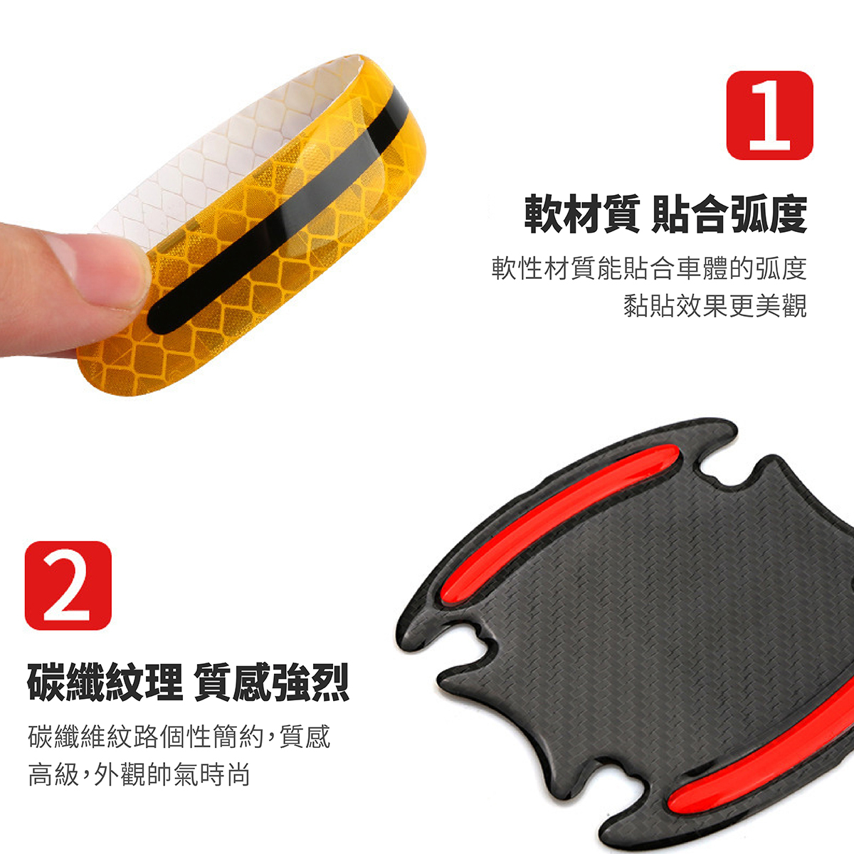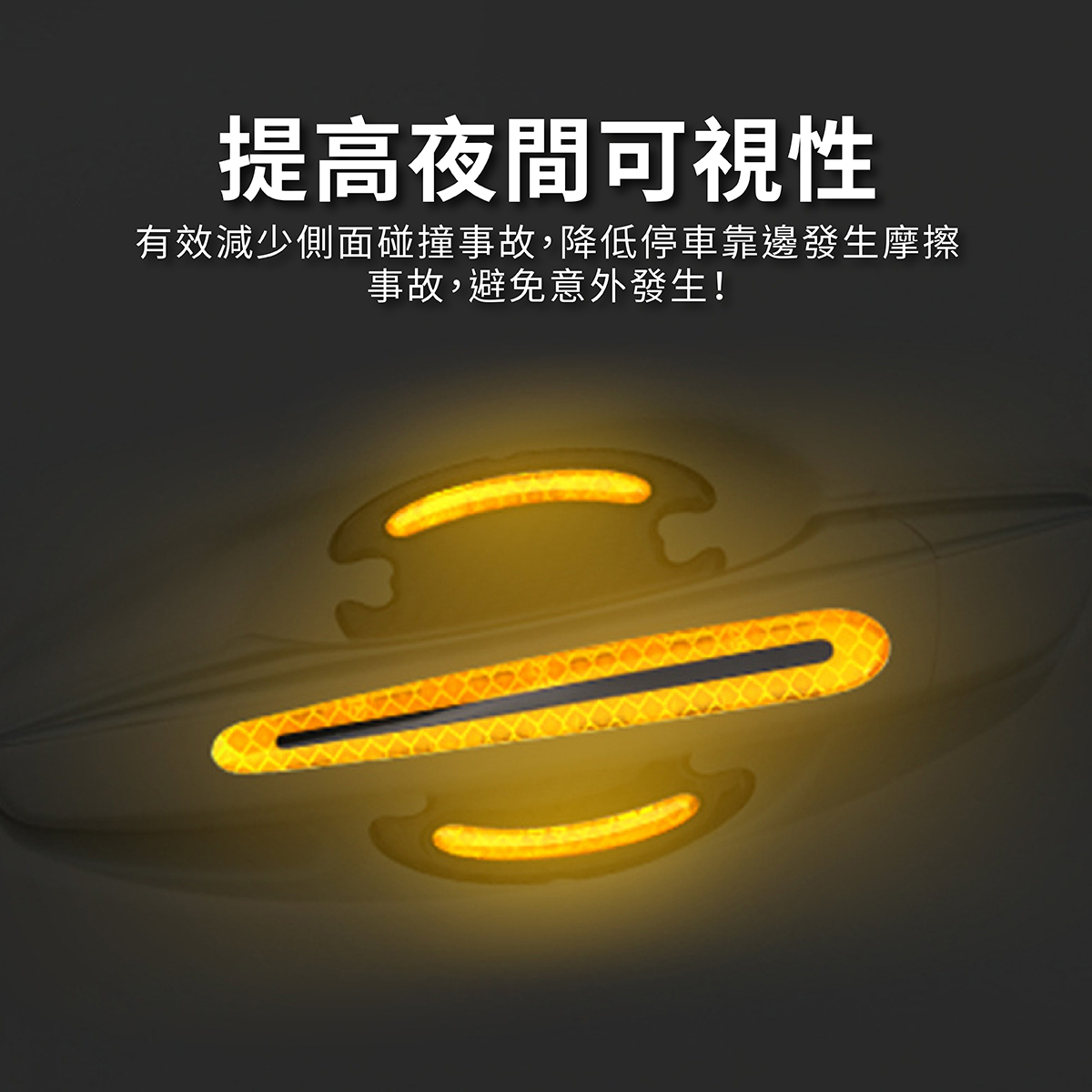 汽車門把防刮警示貼採用全稜鏡反光技術,夜間遇光即強烈反射,提升行車安全性,有效減少碰撞事故。白天可作為車身點綴,增添愛車質感,夜間則提供高亮警示效果。貼片使用EGP材質製成,耐候性強,不易脫落,可貼合車門把手及門碗弧度,防止刮傷、碰撞,安裝簡便,無需工具即可完成。提供白色、黃色、紅色及螢光綠四種顏色選擇,滿足不同車款風格需求,讓您的愛車兼具安全與美觀。