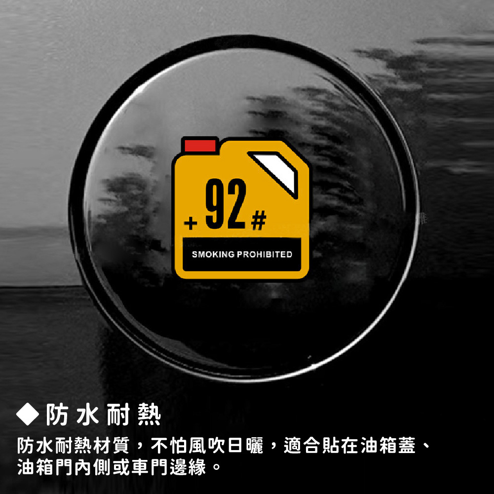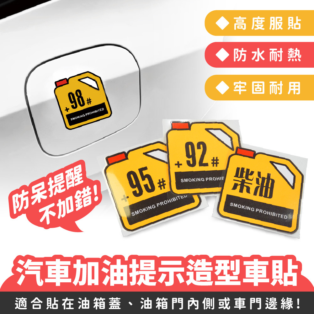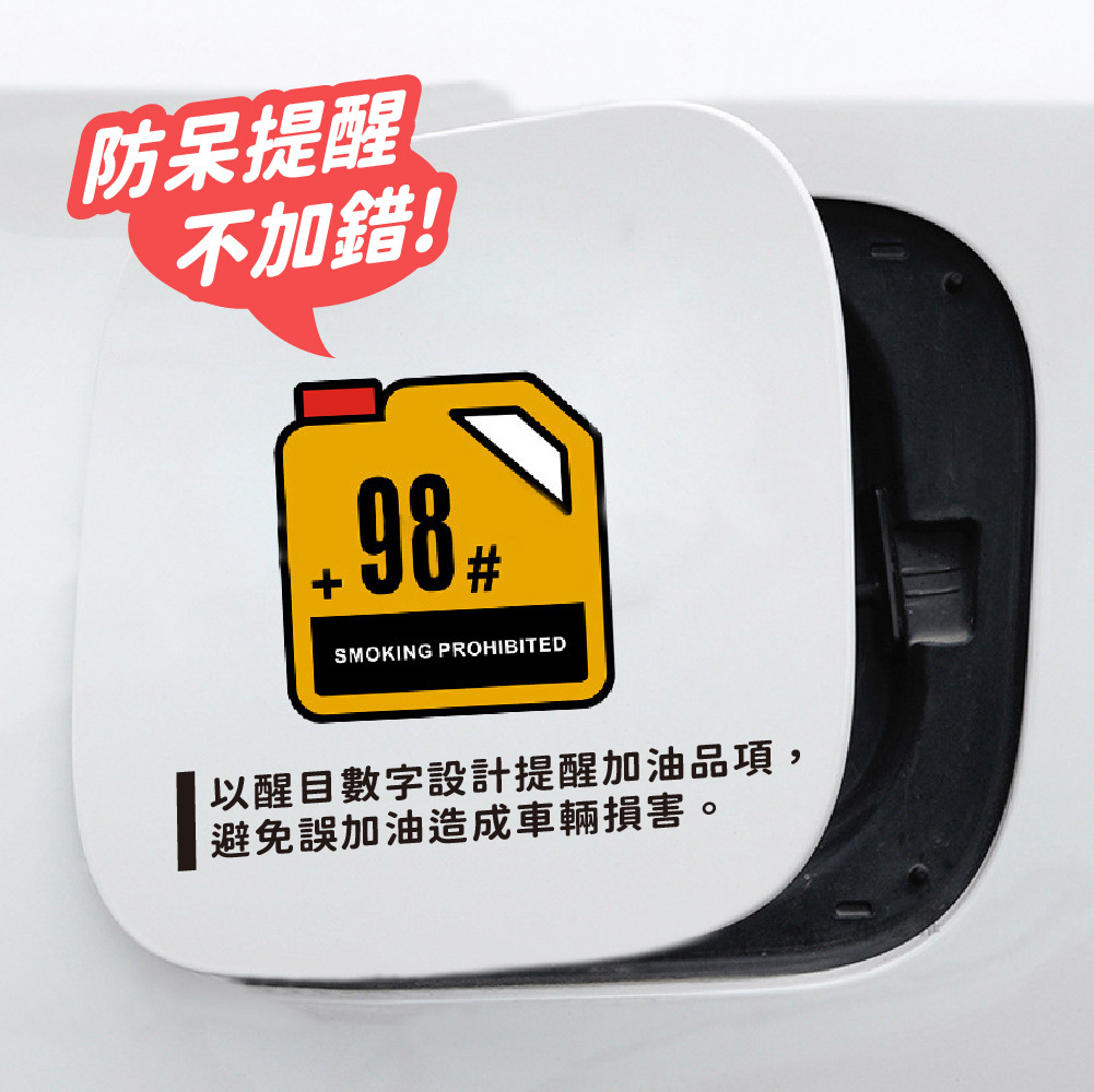 ✅汽車加油提示造型車貼,提供 98、95、92 與柴油四款可選,以醒目數字設計提醒加油品項,避免誤加油造成車輛損害。防水耐熱材質,不怕風吹日曬,適合貼在油箱蓋、油箱門內側或車門邊緣。安裝簡單、牢固不易脫落,是實用又美觀的小貼紙。