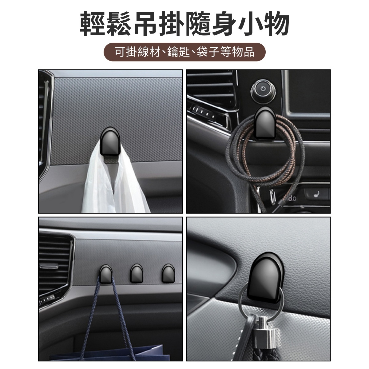 此外,掛勾表面採用圓潤無稜角設計,使用安全不刮手,不影響車內美觀與舒適度。適用於掛鑰匙、購物袋、充電線、雨傘等日常小物,避免物品散落,提升駕駛便利性。ABS材質耐用穩固,不易變形,安裝簡單無需工具,撕開背膠即可使用,適用於各種車款。簡約黑色外觀低調百搭,與車內風格完美融合,是車主理想的收納解決方案。