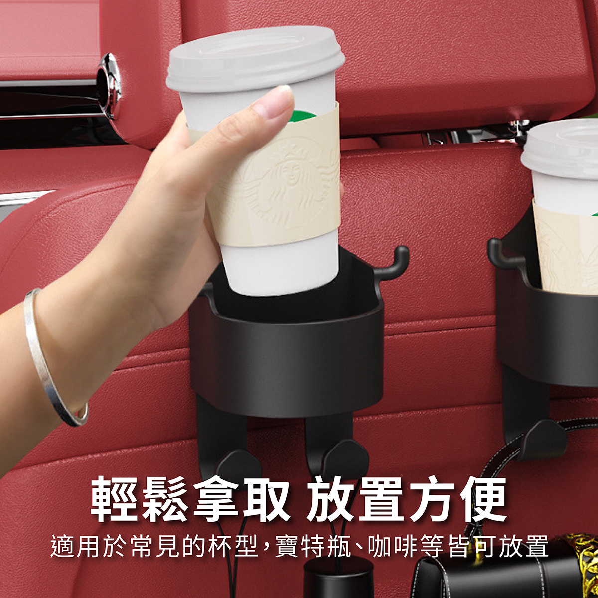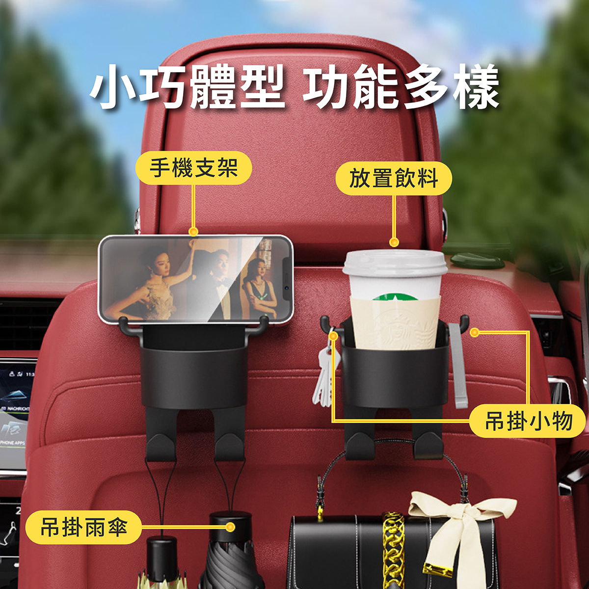 汽車多功能杯架掛勾,集杯架與掛勾於一體,可輕鬆收納飲料、手機、包包等隨身物品,讓車內更整潔。採用耐用 ABS 材質,堅固穩定,適用多種車型。雙掛勾設計,可同時吊掛購物袋、雨傘等小物,提升使用便利性。安裝簡單,不占空間,是提升行車舒適度的必備收納好物。
