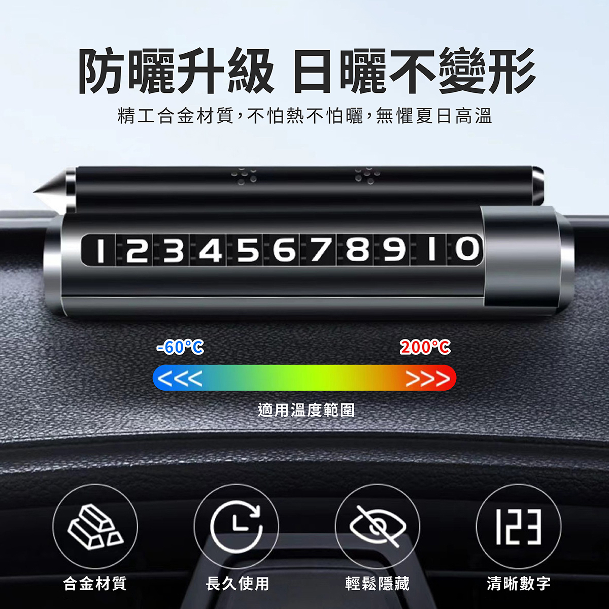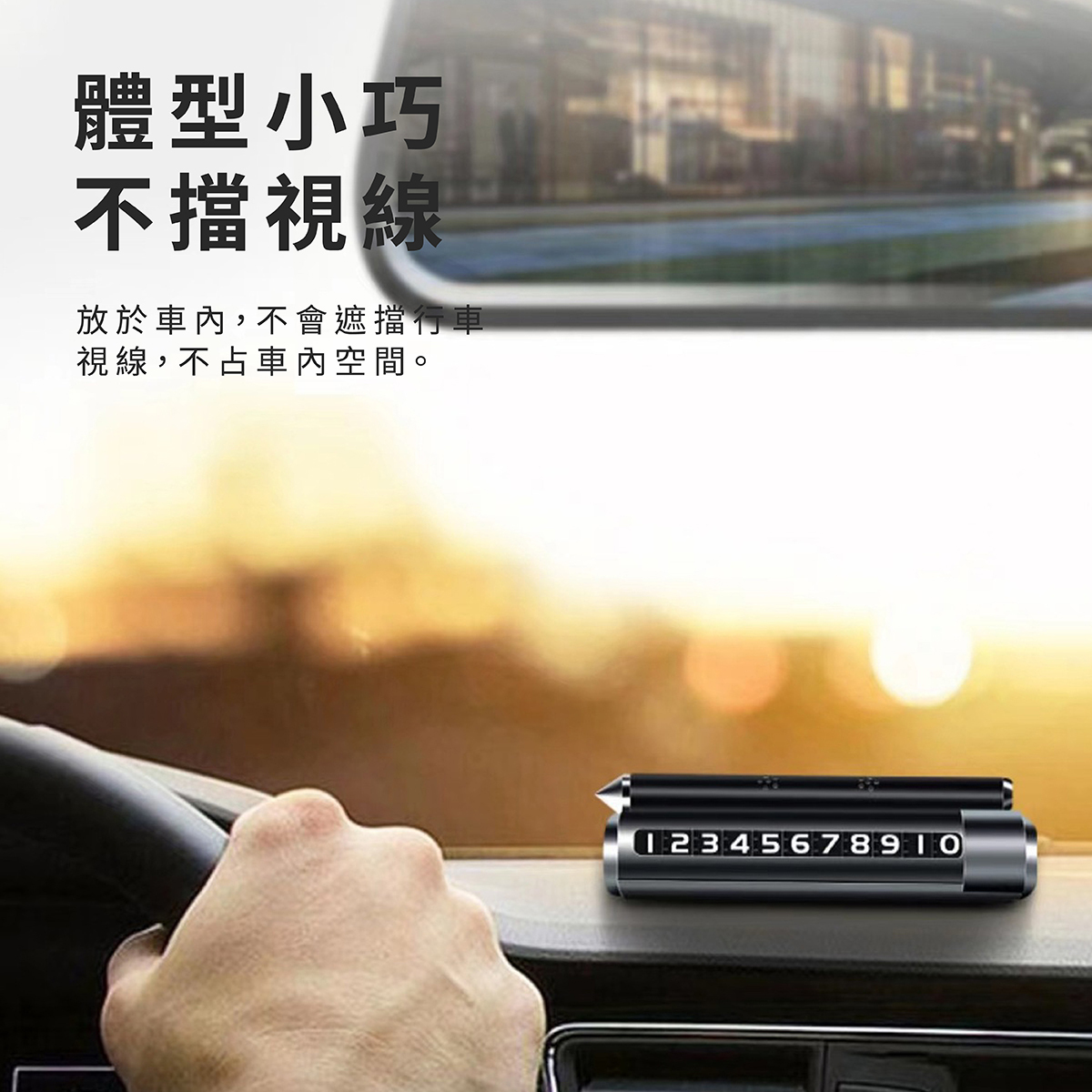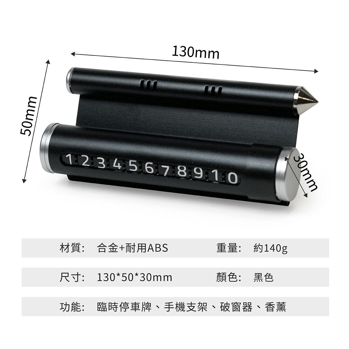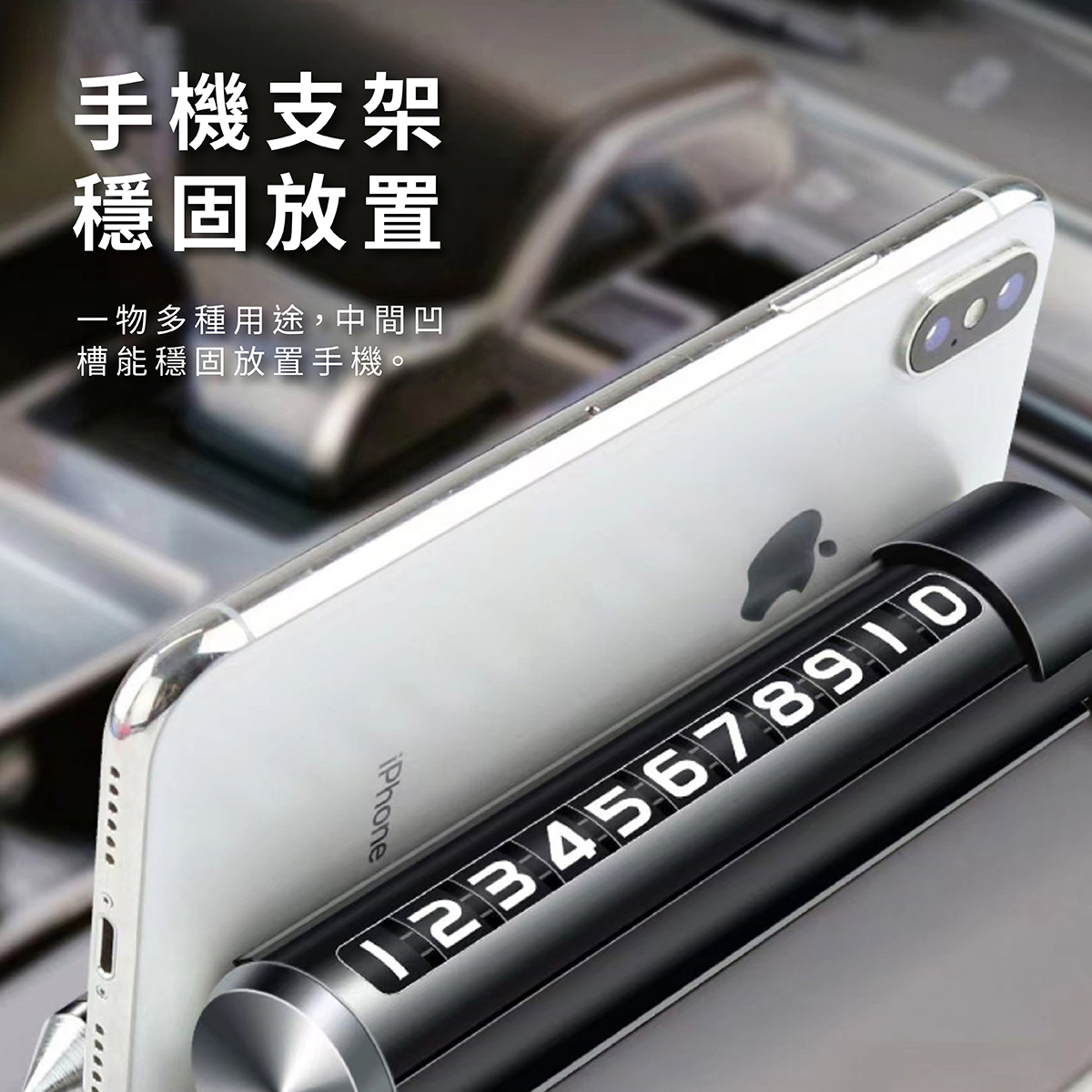 汽車臨停手機號碼牌,具備滾輪轉動設計,數字清晰易讀,讓您在臨停時輕鬆顯示手機號碼,避免不必要的麻煩。小巧的體型不會擋住行車視線,且防曬升級,無論在烈日下也能保持原貌,不易變形。這款號碼牌同時結合手機支架、破窗器及香燻等多種功能,實用性極高,為您的駕車生活增添更多便利。無論是日常停車還是緊急情況,它都是您的理想選擇。