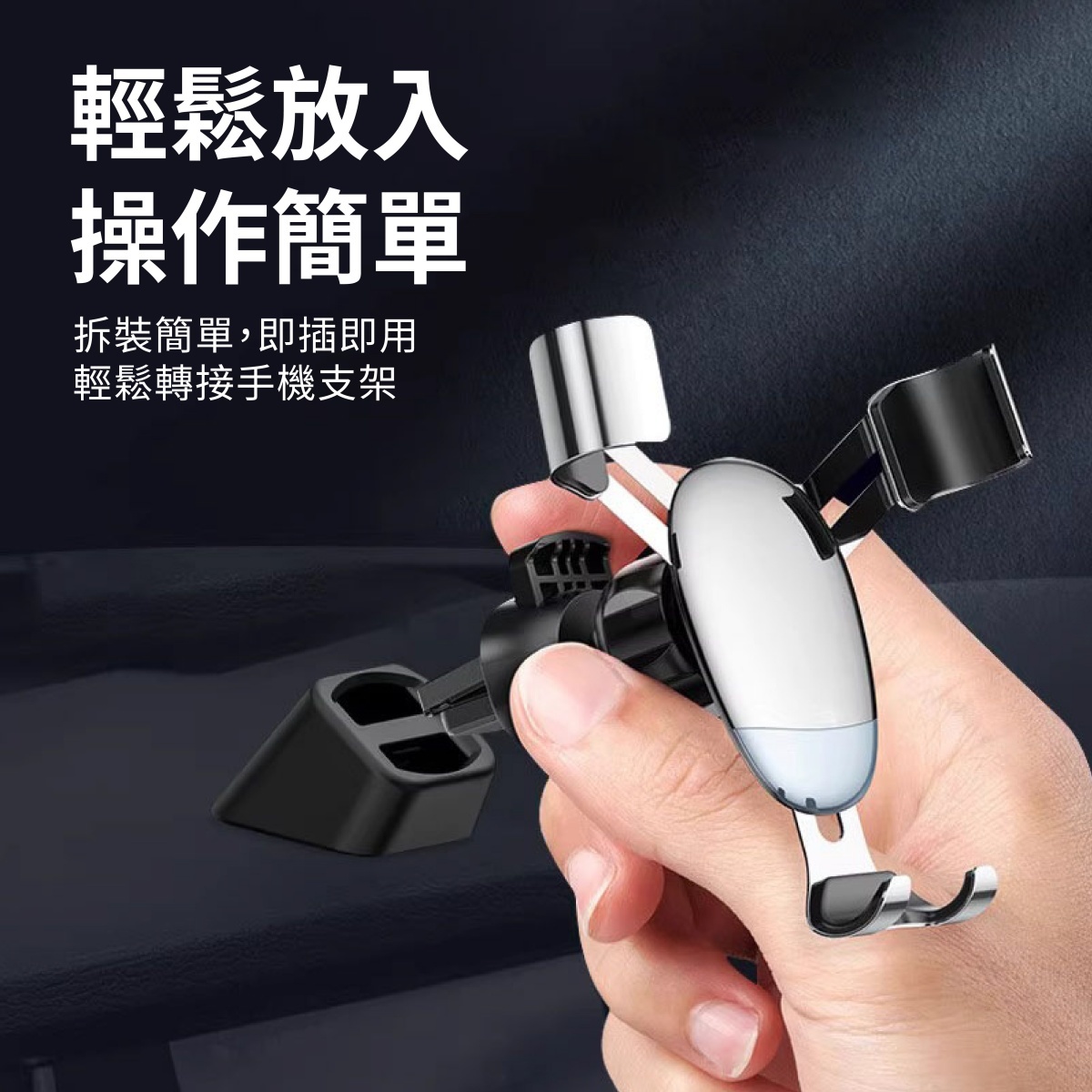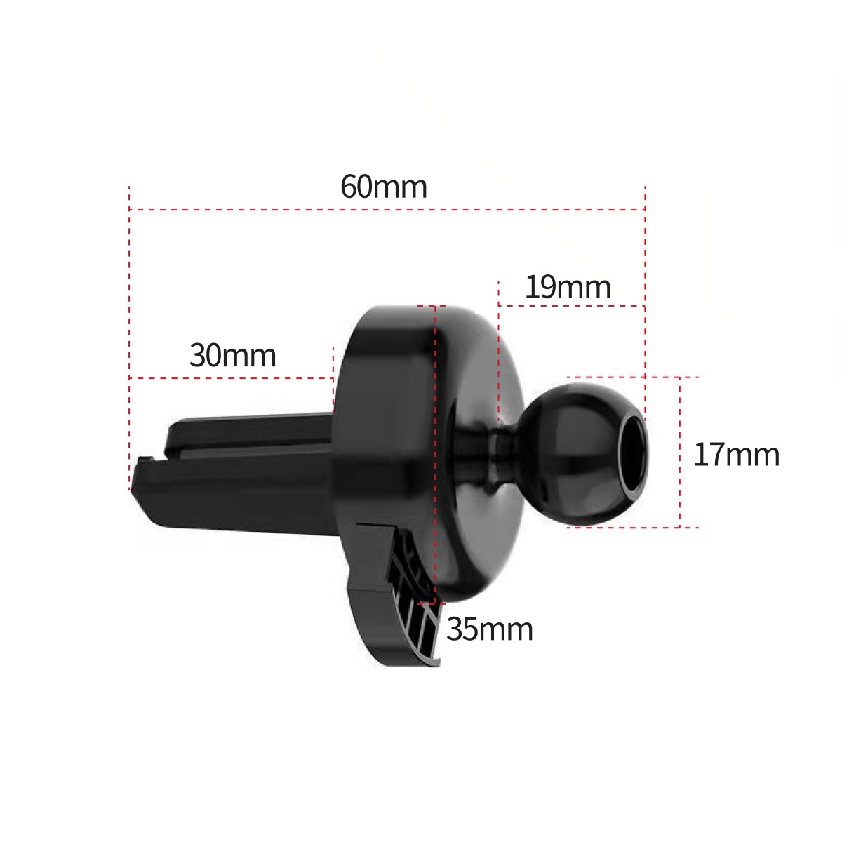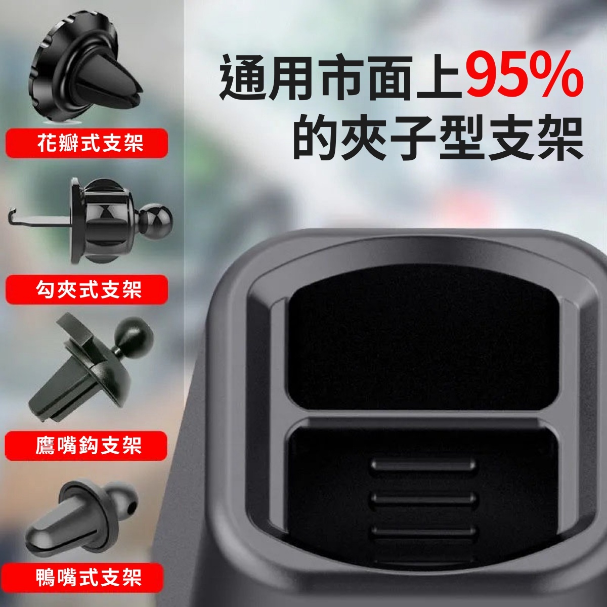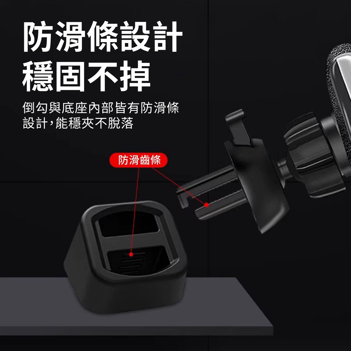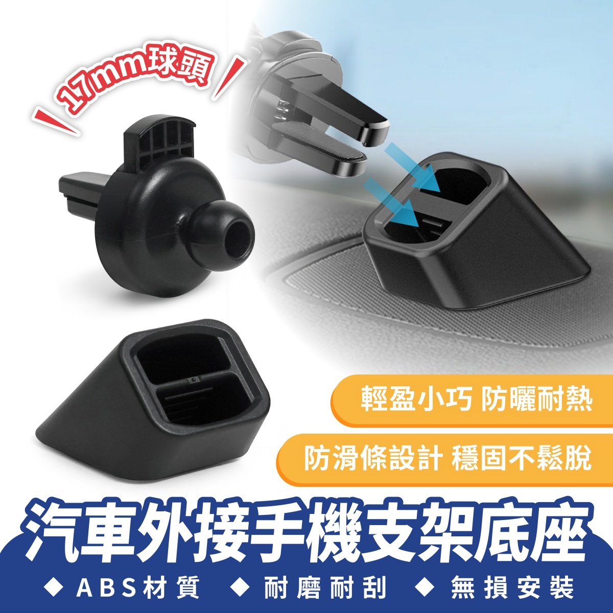 支架底座與鷹嘴倒鈎皆有防滑條,能穩穩固定不滑落;底座通用市面上 95% 夾型出風口手機支架,17mm 球頭鷹嘴倒鉤,可直接安裝於圓形出風口並轉接多款手機支架。輕巧不占空間,不遮擋駕駛視線,是提升用車便利性的最佳升級小物。