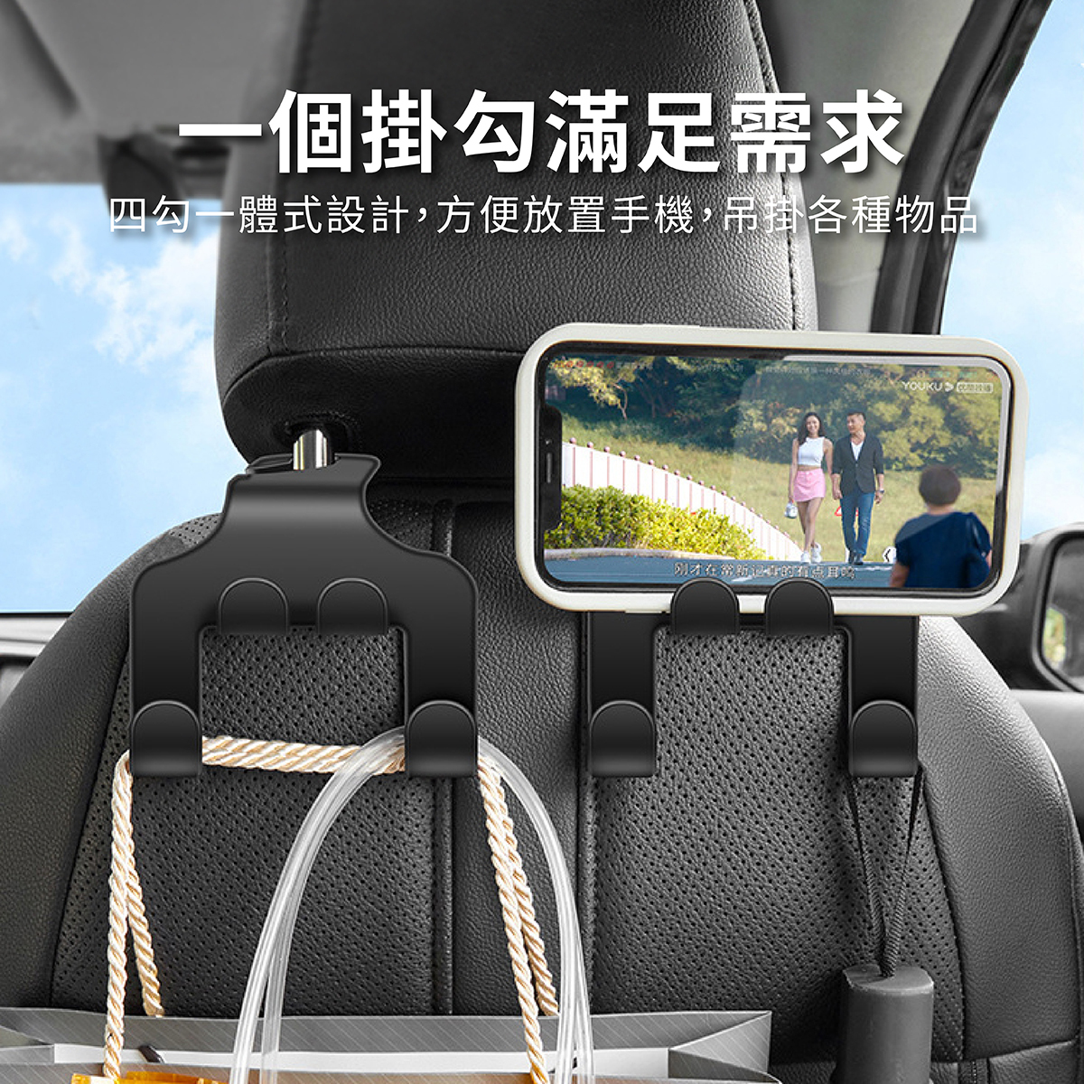 XILLA 汽車椅背手機架掛勾,採用耐用 ABS 材質,體積小巧但承重力強,能穩固放置手機,並可吊掛包包、飲料、購物袋等物品。四勾一體式設計,提升車內收納空間,讓前後座都能輕鬆存放隨身物品。安裝簡單,直接固定於椅背,不傷座椅,適用多種車型,是提升車內便利性與整潔度的理想選擇。