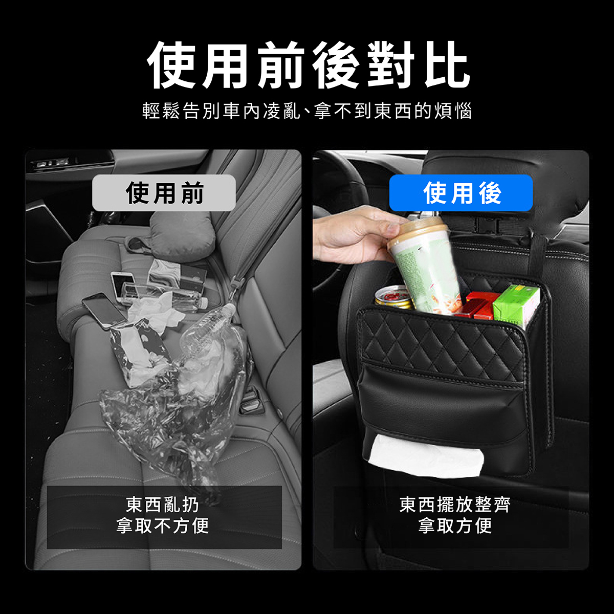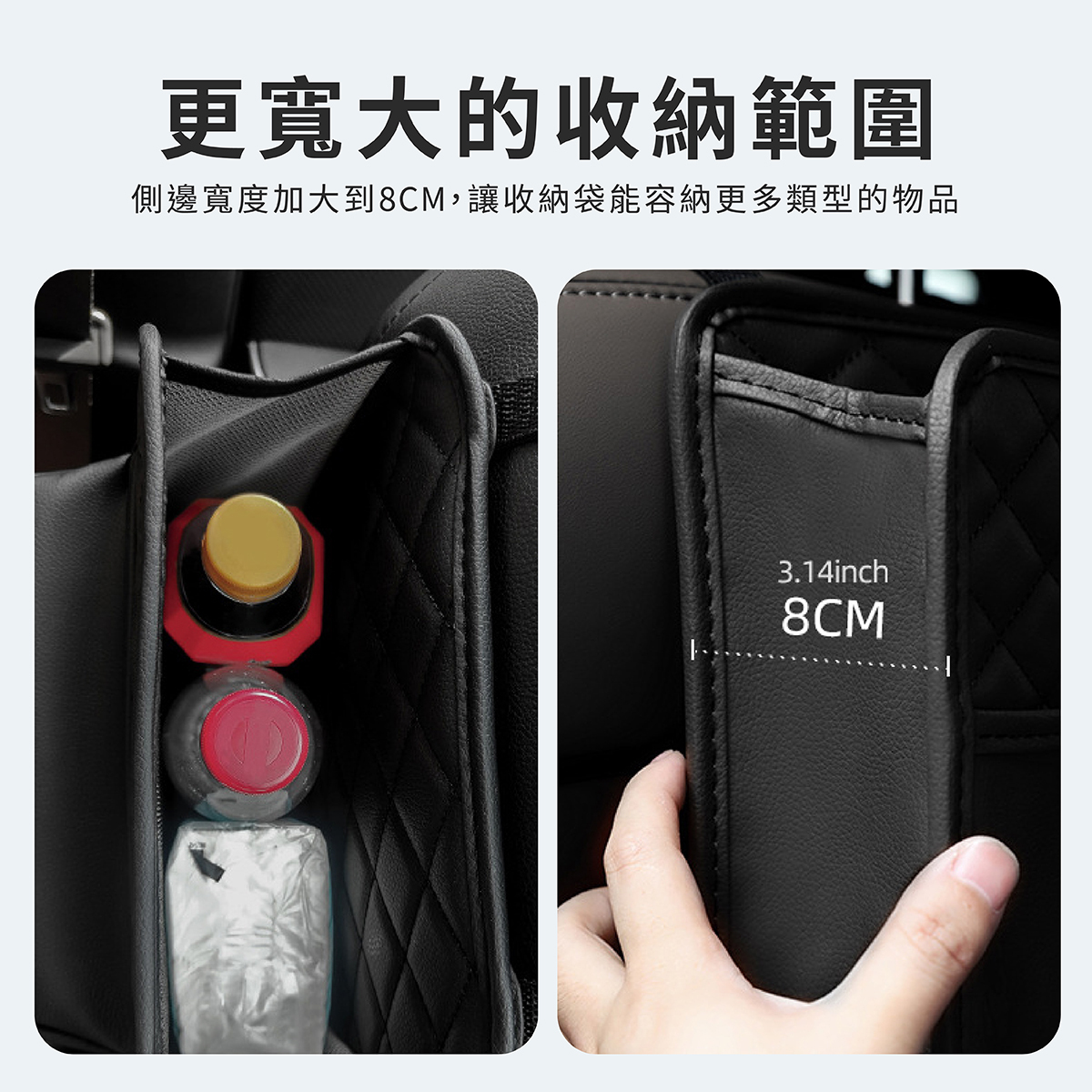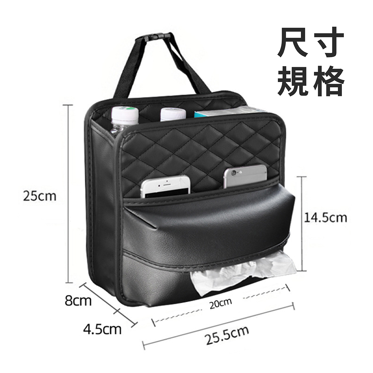 汽車椅背皮革收納袋,為車內空間整理提供便利解決方案,大容量設計能有效收納手機、錢包、飲料、紙巾等物品,保持車內整潔不凌亂。採用PU皮革材質,耐磨防污,兼具質感與實用性。獨特綁帶+夾扣式安裝,拆裝簡單快速,穩固固定不晃動。開口設計方便隨手拿取,使用靈活,不影響乘坐舒適度。適用於各類車型,是日常通勤、親子出行與長途旅行的理想車內收納工具。