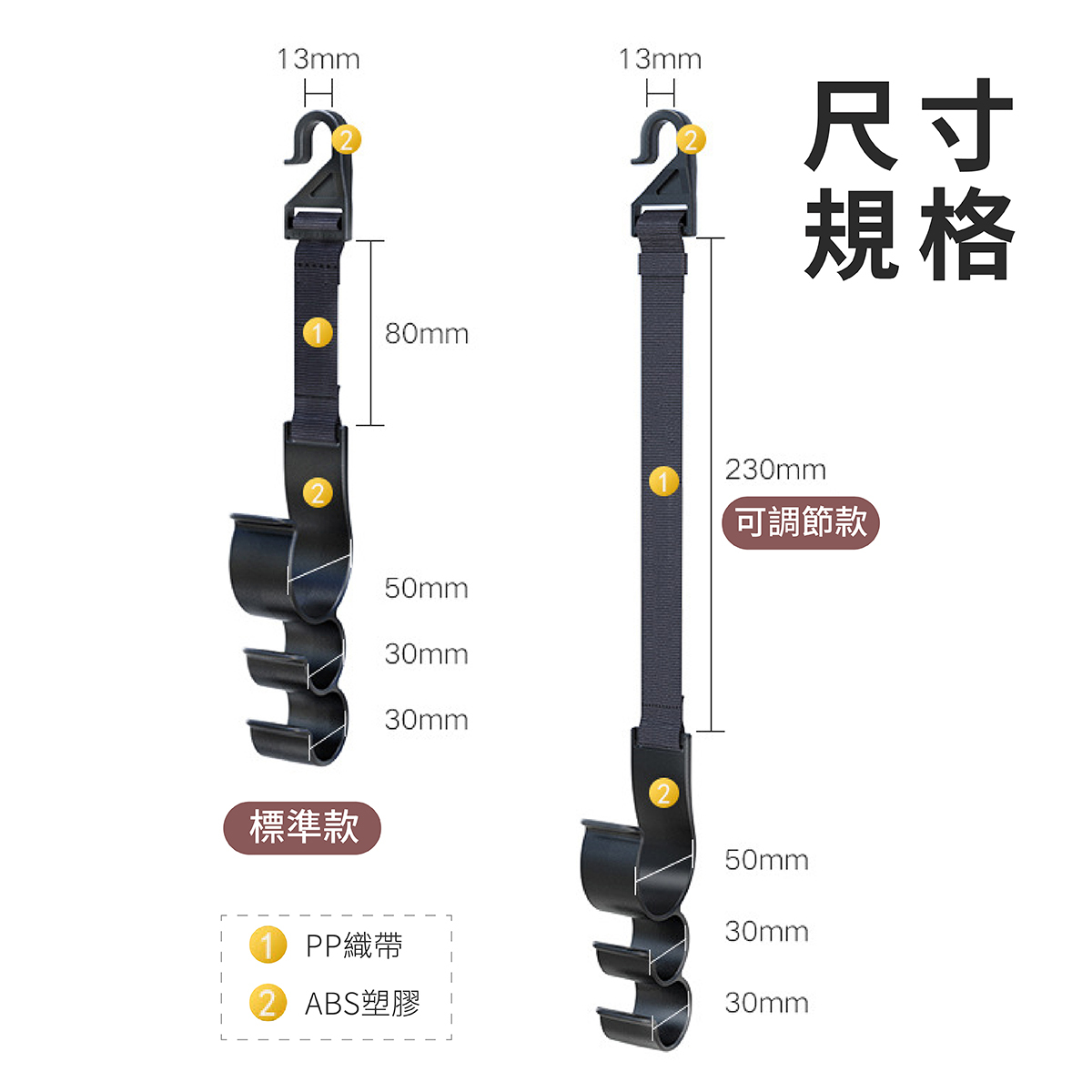 材質:ABS、織帶🔴建議安裝在直徑10-14mm內的頭枕連接桿上。