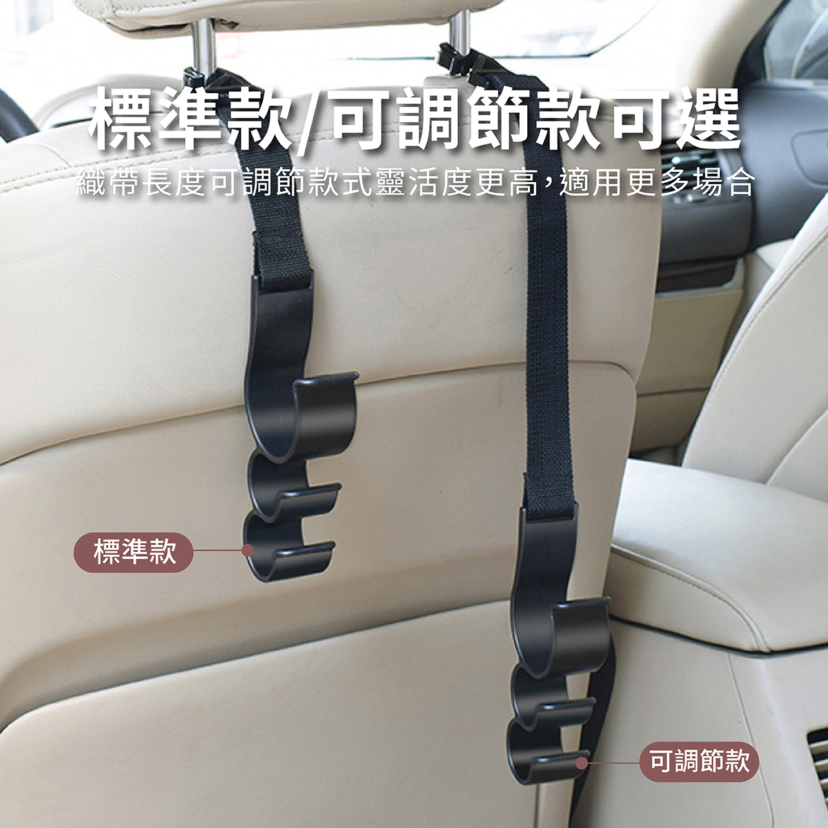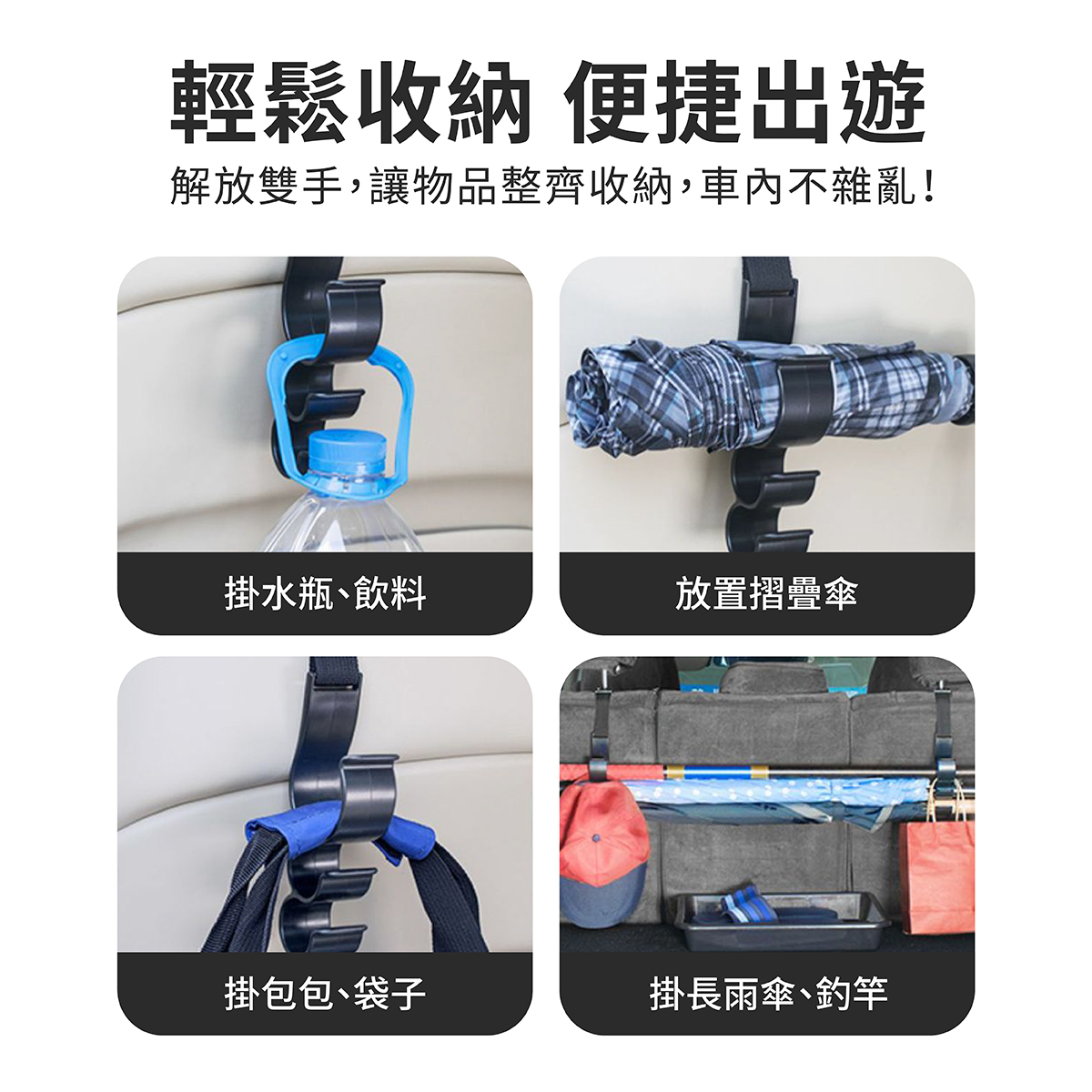 汽車椅背雨傘掛勾,採用優質 ABS 材質,堅固耐用,具備 15KG 超高承重力,可穩固吊掛雨傘、購物袋、包包等物品,保持車內整潔。適用於直徑 10-14mm 的頭枕連接桿,通用各類車型,安裝簡單無需工具。提供標準款與可調節款選擇,讓您根據需求自由搭配,是車內收納的實用好幫手。