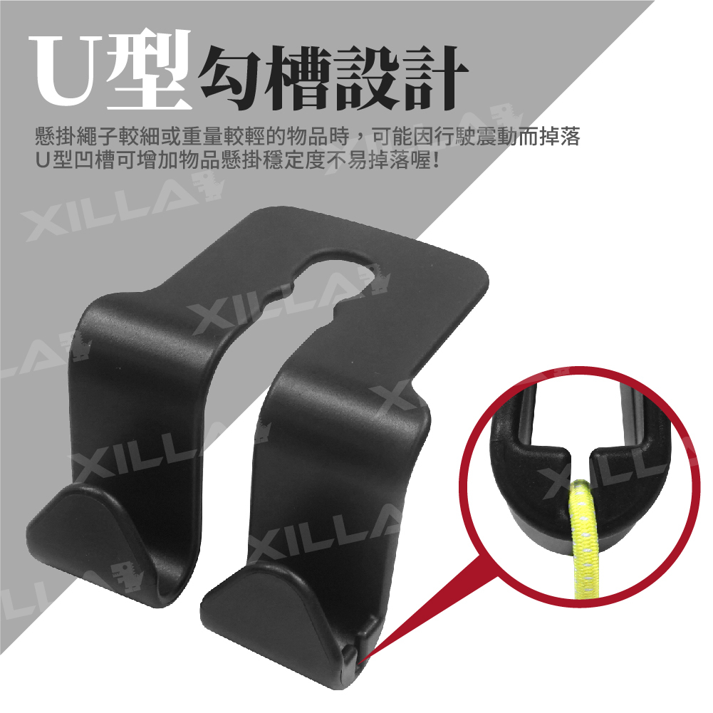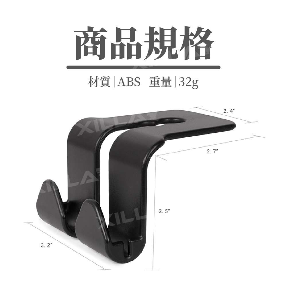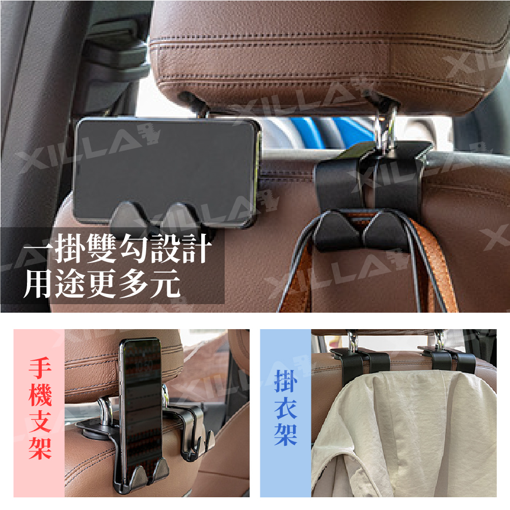 汽車椅背雙頭掛勾,一掛雙勾設計,可同時懸掛多種物品,輕鬆整理車內空間!不僅是掛勾,更可作為手機支架使用,提升乘車舒適度。採用U型勾槽設計,即使是輕巧物品(如口罩)也能穩固不掉。ABS優質材質,一體成型堅固耐用,最高可承重20kg,適用各類車款,安裝簡單不占空間,讓您的車內更加整潔有序!