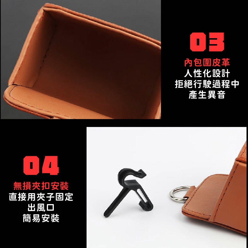 汽車出風口置物盒,專為車主設計,讓車內收納更簡單、更整潔。此置物盒採用優質皮革全面包覆,具備超高負重能力,能輕鬆放置卡片、發票、手機等小物品,提升車內空間利用率。大開口設計,放取物品更方便,且安裝簡單,不會損傷車輛。無論是長途駕駛還是短途出行,都能讓你的車內保持整潔有序。