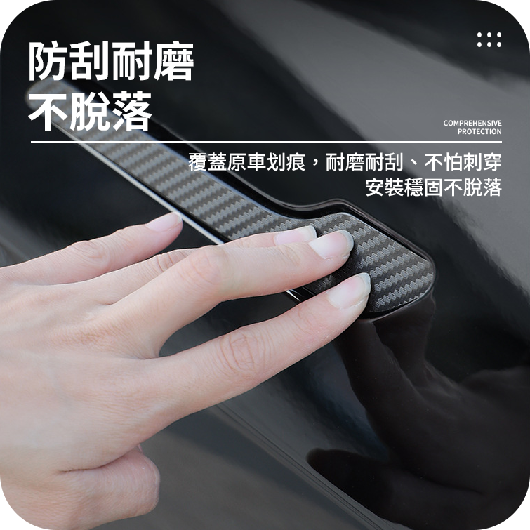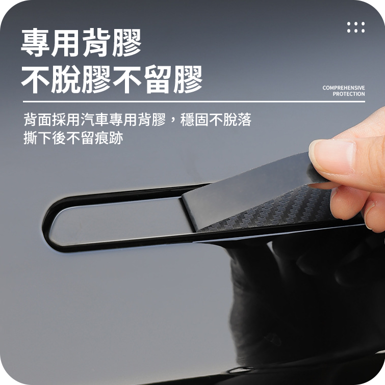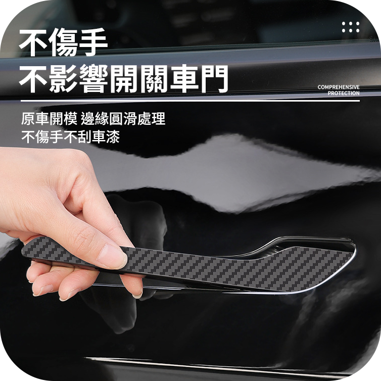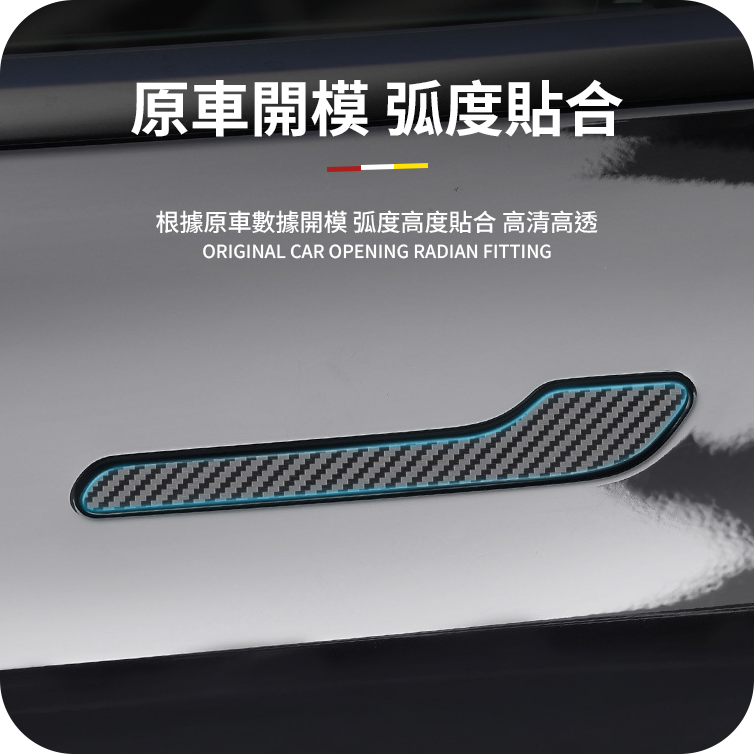 碳纖維車門拉手裝飾貼,專為特斯拉 Model 3/Y量身定製,完美貼合車門拉手,提升愛車外觀質感。專用背膠設計,安裝後不脫膠,不會留痕,保護車漆。原車開模,邊緣經過圓滑處理,既不傷手也不會刮傷車漆。防刮耐磨的碳纖維材質,讓您的車門拉手始終保持最佳狀態,即使長時間使用也不易脫落。輕鬆安裝,完美提升車輛的運動感與時尚感。