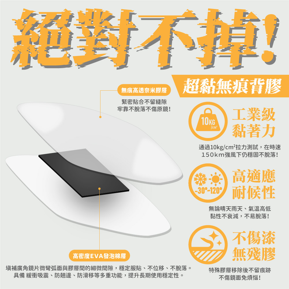●廣角鏡片可剛好卡在原廠後照鏡鏡框內,邊緣黑邊是原廠後照鏡原本就有的,而側面看鏡片會發現稍微突出邊框也是正常現象,並不影響使用。