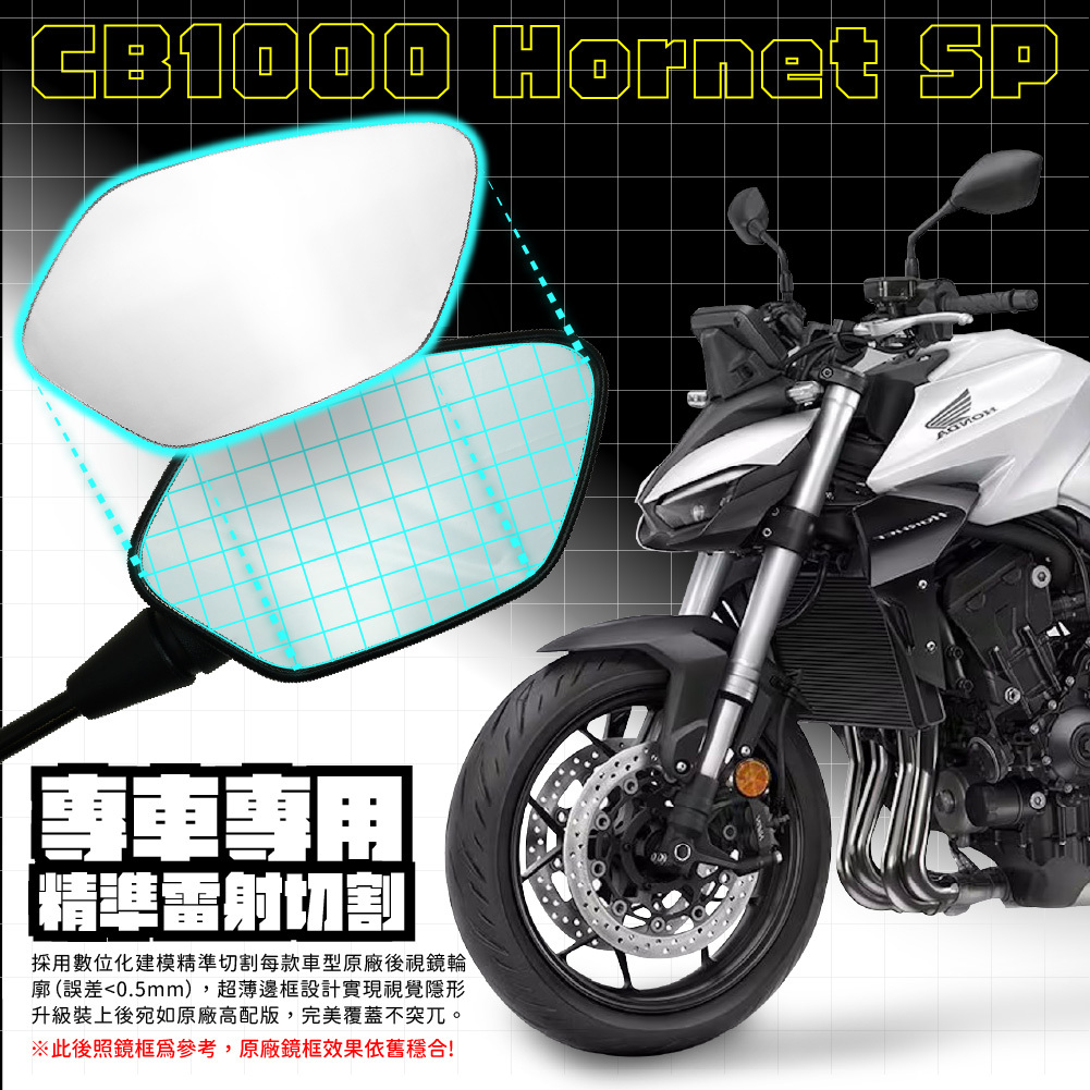 HONDA CB1000 Hornet SP 專用「超視野廣角後照鏡」專為高性能街車騎乘設計,凸面廣角鏡片提供更寬闊的後方視野,有效降低盲區,提高變道與車陣穿梭的安全性。高透光防眩光鏡面,即使夜間或逆光環境也能清晰呈現後方影像,減少視覺干擾。穩固支架結構抑制行駛震動,保持影像穩定,多段角度可調整,快速找到符合騎士坐姿的最佳視角。專車直上安裝,不影響外觀線條,是CB1000 Hornet SP日常通勤與長途騎行的理想安全配件。