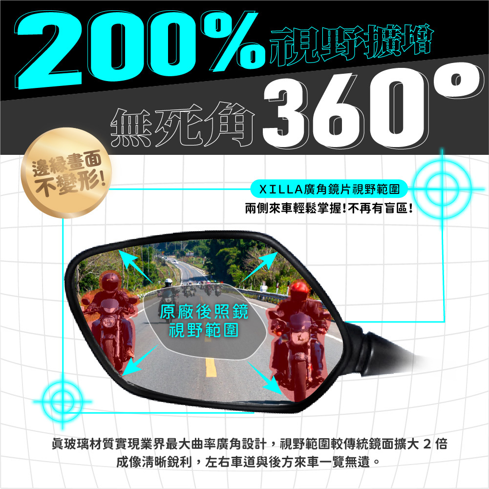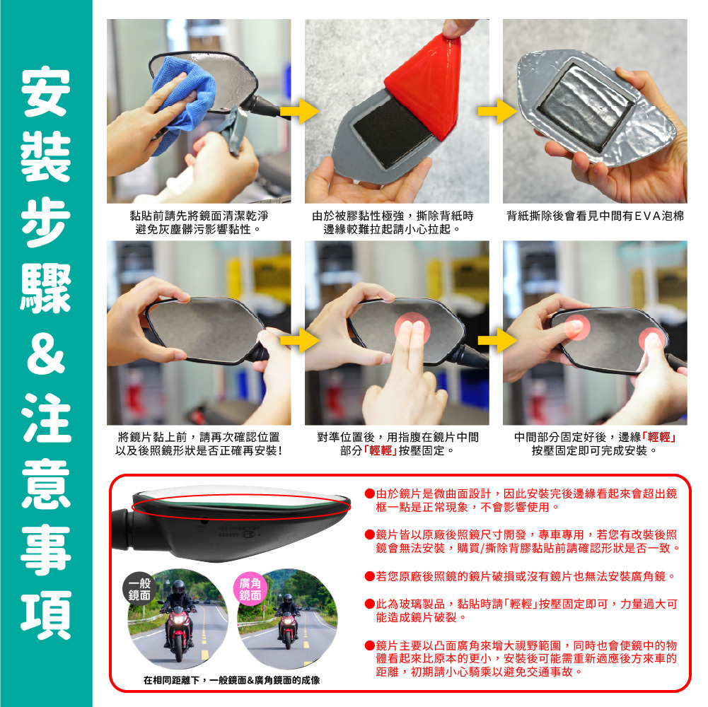 ●鏡片主要以凸面廣角來增大視野範圍,同時也會使鏡中的物體看起來比原本的更小,安裝後可能需重新適應後方來車的距離,初期請小心騎乘以避免交通事故。