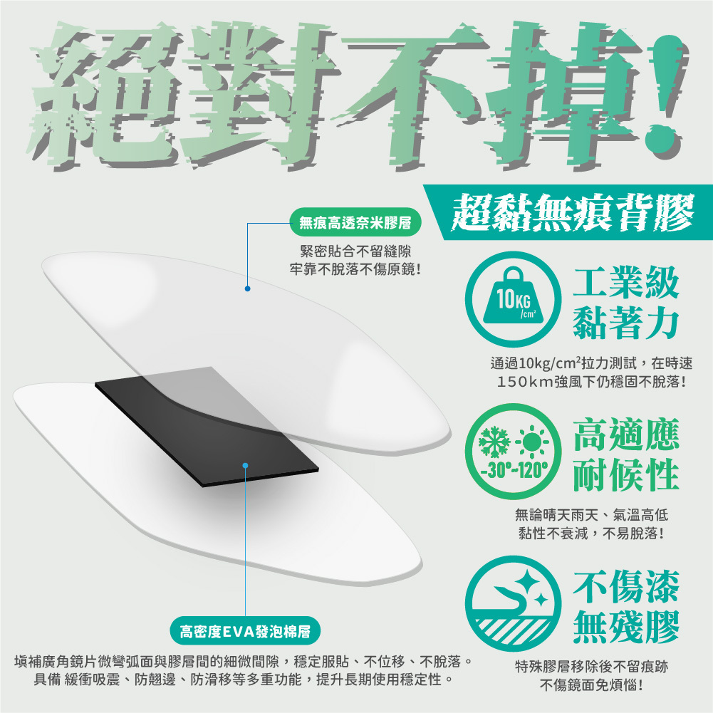 ●鏡片皆以原廠後照鏡尺寸開發,專車專用,若您有改裝後照鏡會無法安裝,購買/撕除背膠黏貼前請確認形狀是否一致。