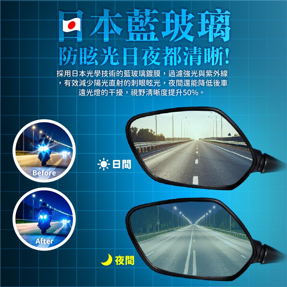 採用日本光學技術的藍玻璃鍍膜,過濾強光與紫外線,有效減少陽光直射的刺眼眩光,夜間還能降低後車遠光燈的干擾,視野清晰度提升50%。