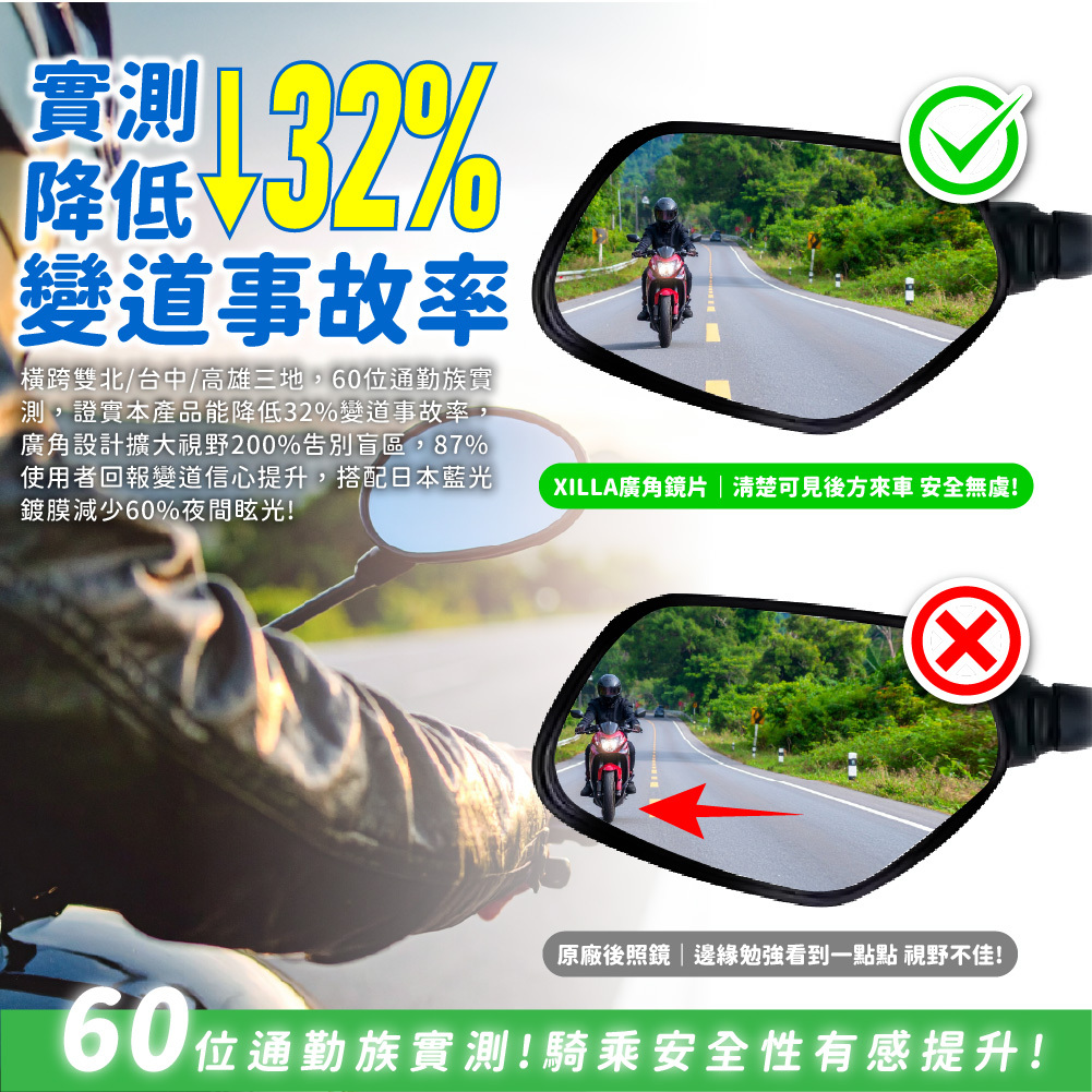 橫跨雙北/台中/高雄三地,60位通勤族實測,證實本產品能降低32%變道事故率,廣角設計擴大視野200%告別盲區,87%使用者回報變道信心提升,搭配日本藍光鍍膜減少60%夜間眩光