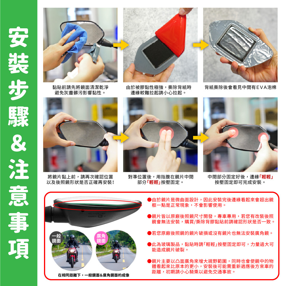 ●鏡片主要以凸面廣角來增大視野範圍,同時也會使鏡中的物體看起來比原本的更小,安裝後可能需重新適應後方來車的距離,初期請小心騎乘以避免交通事故。