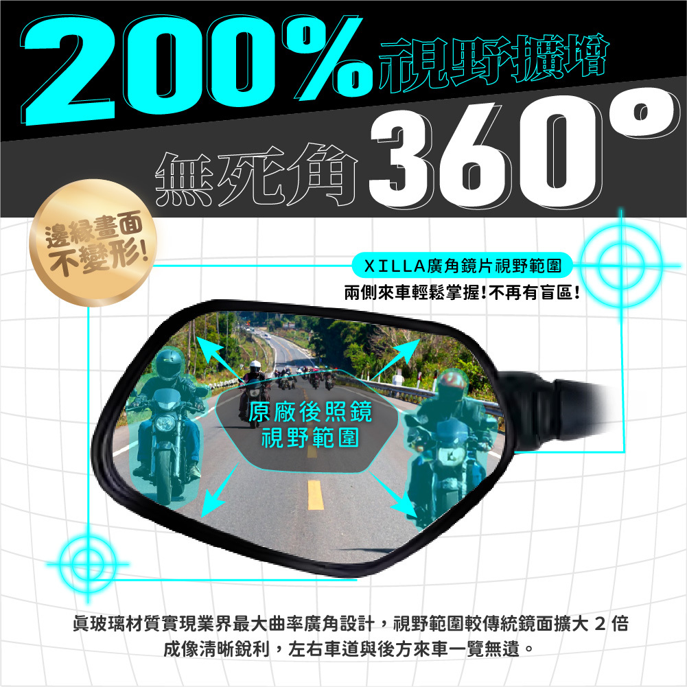 ●鏡片主要以凸面廣角來增大視野範圍,同時也會使鏡中的物體看起來比原本的更小,安裝後可能需重新適應後方來車的距離,初期請小心騎乘以避免交通事故。