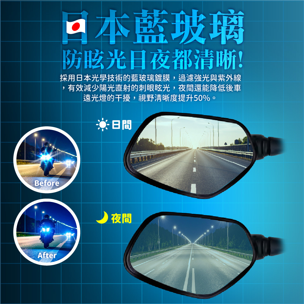 採用日本光學技術的藍玻璃鍍膜,過濾強光與紫外線,有效減少陽光直射的刺眼眩光,夜間還能降低後車遠光燈的干擾,視野清晰度提升50%。
