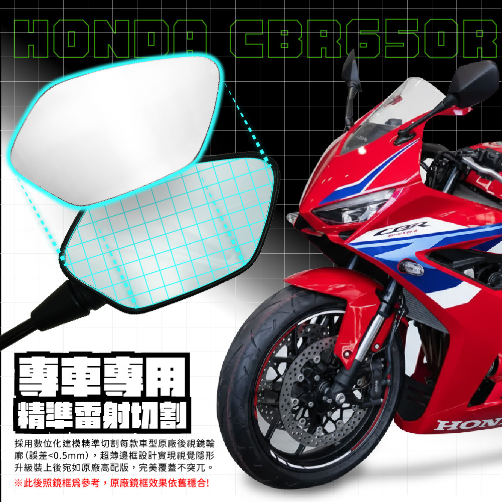 HONDA CBR650R 專用「超視野廣角後照鏡」專為運動街車騎乘設計,凸面廣角鏡片大幅擴展後方視野,有效降低盲區,變道與高速行駛更安心。鏡面採防眩光處理,即使夜間或逆光環境也能清晰觀察後方車況,提升安全性。穩固支架設計減少震動影響,保持影像穩定,多段角度可調整,快速找到最佳視角。專車直上安裝,不破壞CBR650R流線外觀,是通勤、跑山與長途騎乘的理想安全升級配件。
