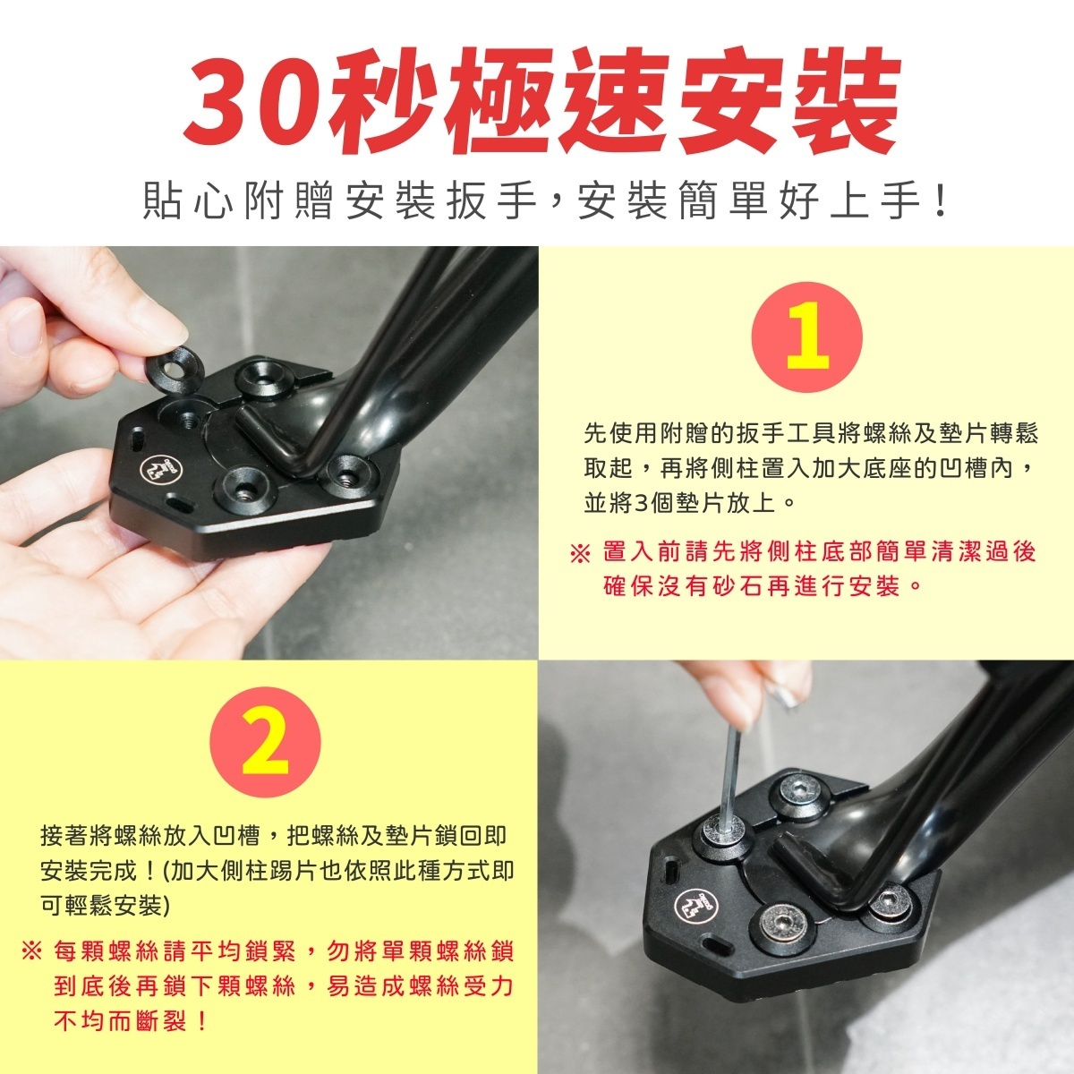 ⚠️若擔心側柱墊片上的螺絲會因長時間震動而鬆脫,或是害怕被偷走,除了定期檢查螺絲是否鬆脫,可另外加購螺絲膠喔!