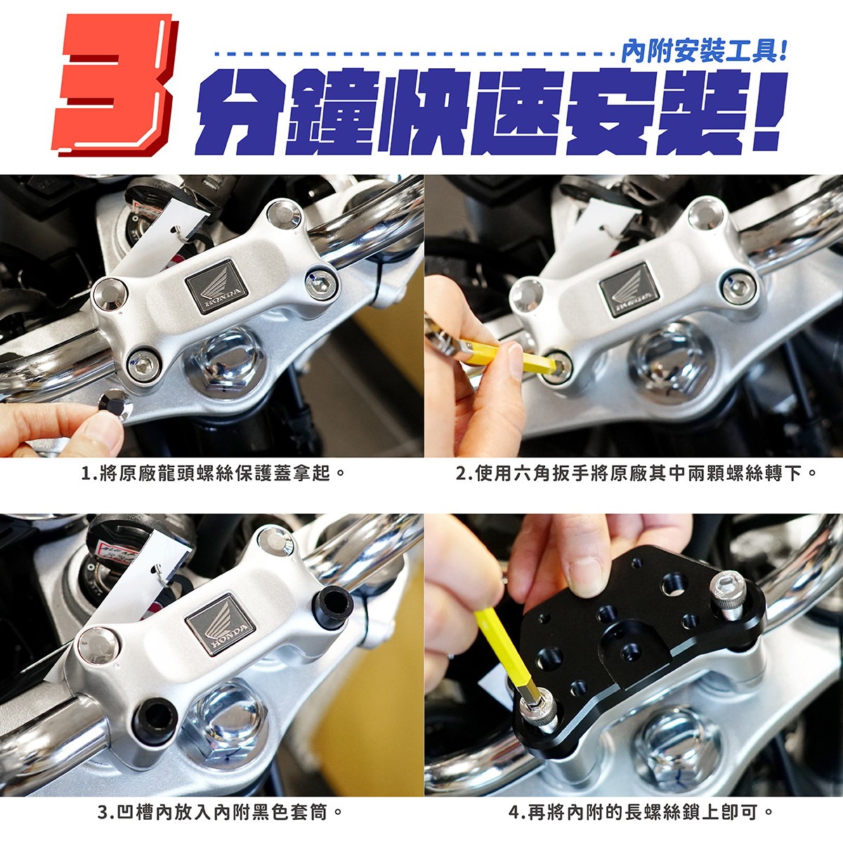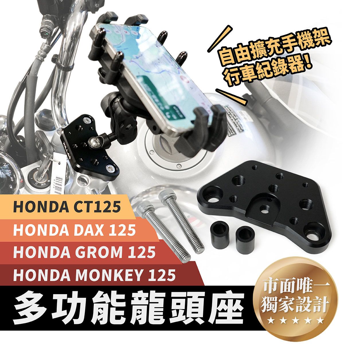 HONDA DAX/CT 125/MONKEY 125/MSX GROM 鋁合金多功能龍頭座,專為這些經典車型設計,提供穩定的支撐和增強的控制感。此龍頭座採用高強度鋁合金製成,輕量且耐用,有效提升車輛的操控性與穩定性。多功能設計可安裝各種配件,如儀表、車把或其他改裝裝置,讓車主可以根據需求進行個性化改裝。安裝簡單,能立即增強車輛的外觀與性能,適合追求卓越操控與外型的車主。