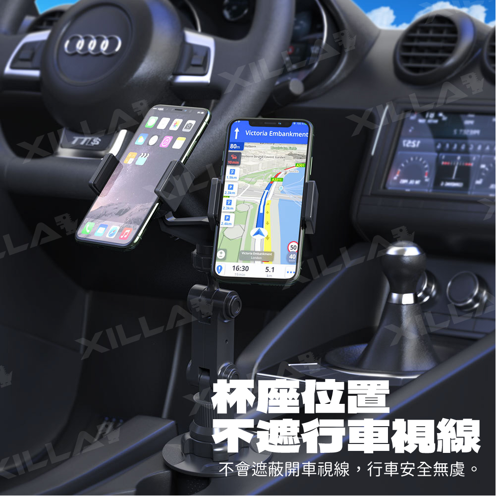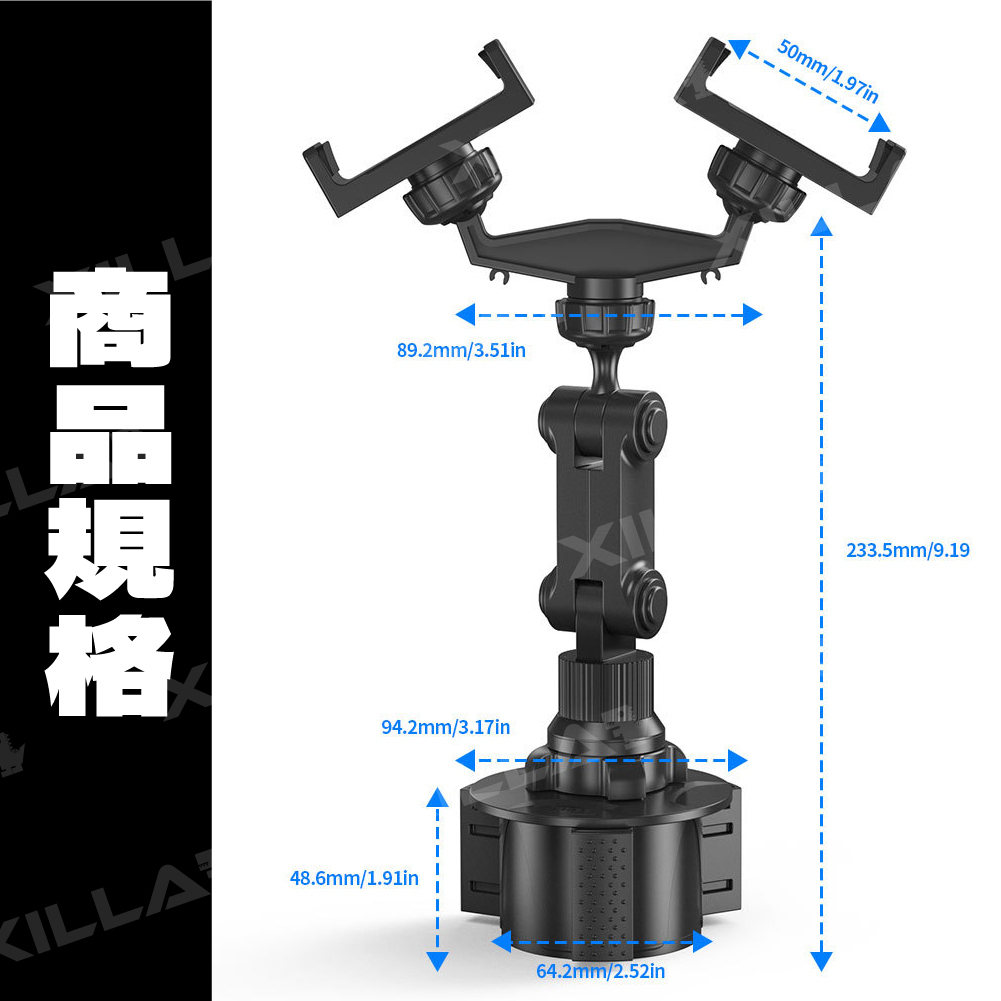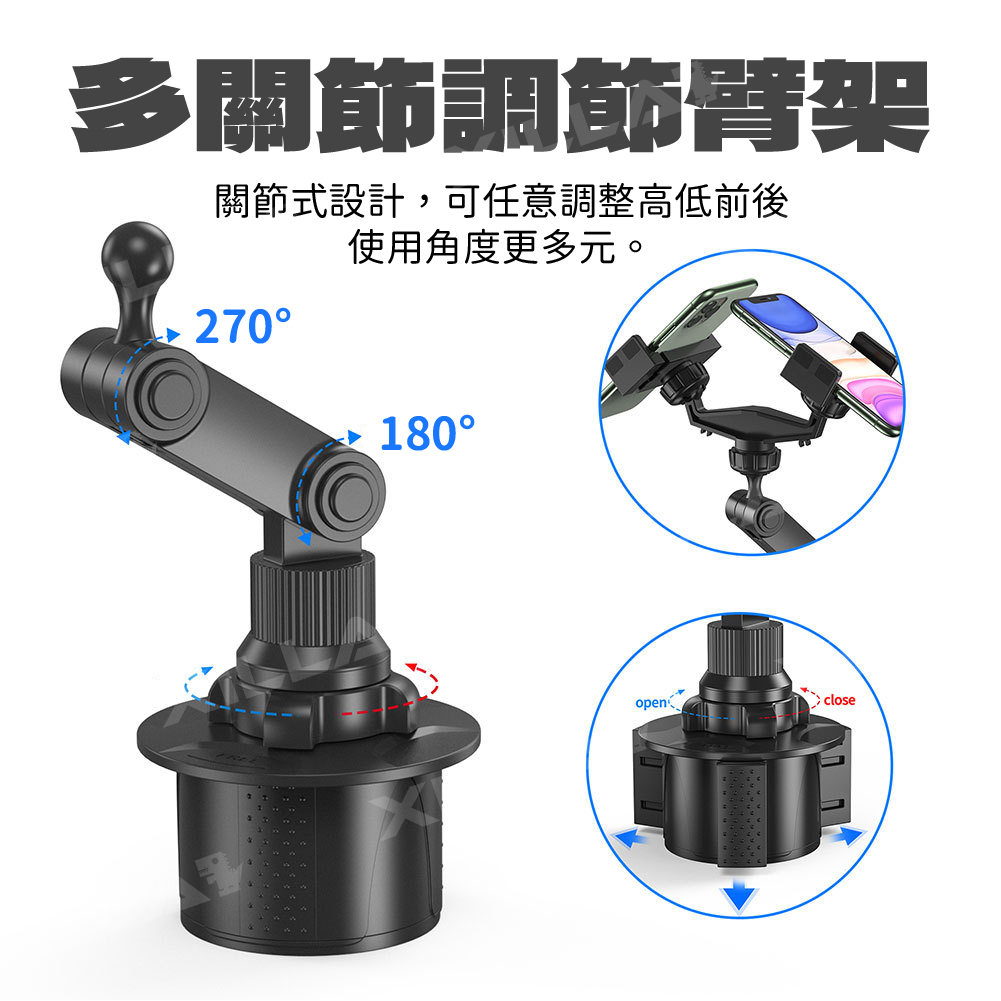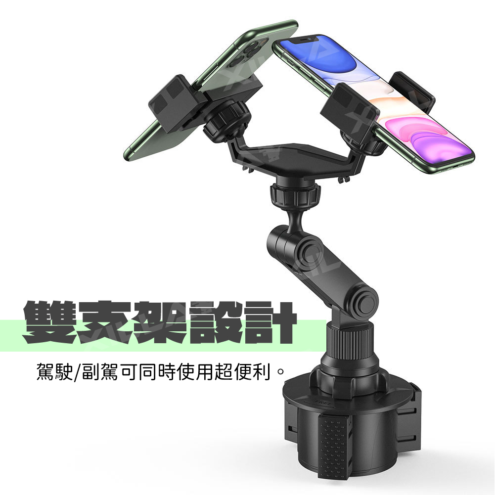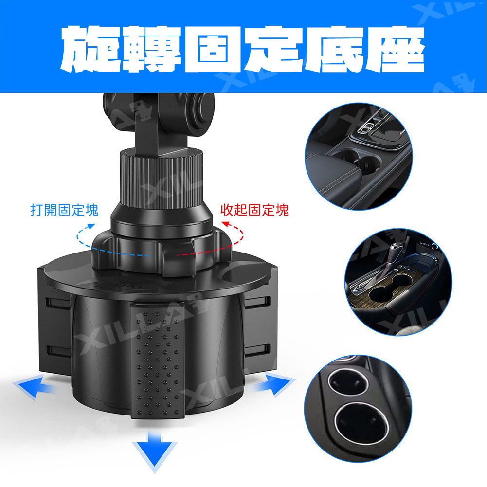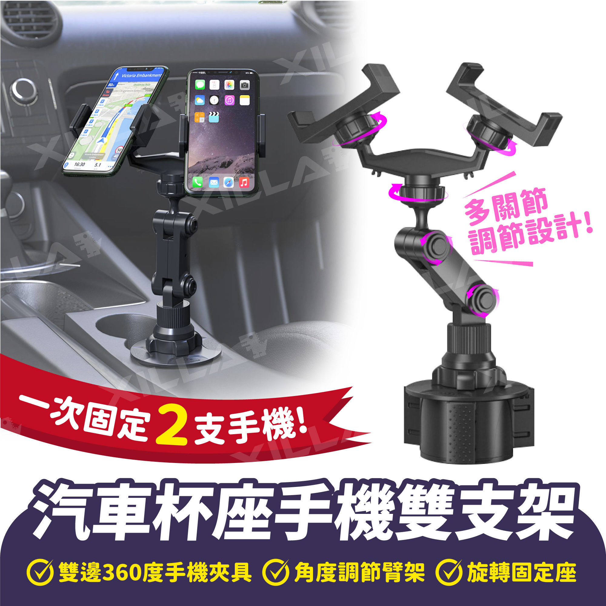 汽車水杯座手機雙支架,突破傳統設計,讓您一次固定兩部手機,輕鬆應對導航和通話需求!獨特的多關節調節臂架設計,提供高度、前後位置調整,使用靈活方便。底部旋轉固定塊確保支架穩固固定在車內的杯座中,無需擔心搖晃。手機夾具支持360度調整,無論是直屏或橫屏使用都能輕鬆應對,提升駕駛便利性。無論導航還是娛樂,都能為您提供最佳視角。