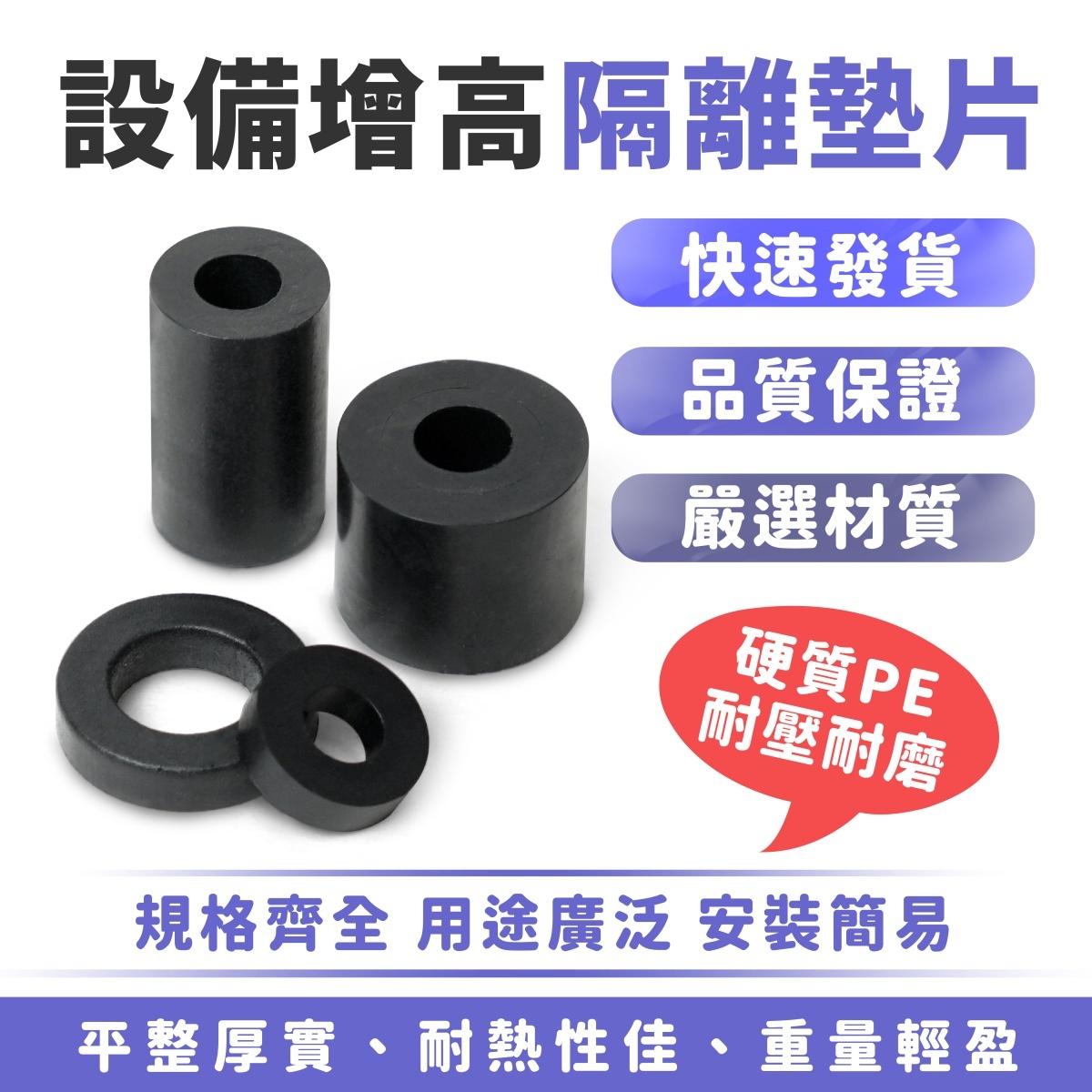 設備增高隔離墊片,專為各類設備提供穩定支撐與隔離效果。採用高品質硬質 PE 材質製成,具備優異的耐熱性與耐壓性,即使長時間使用也不易變形或磨損。墊片表面厚實平整,能有效減少設備與地面的直接接觸,降低震動與噪音。產品輕巧實用,不占空間,提供多種尺寸規格,適用於機械設備、電子裝置、家用電器等各式應用場景,是設備安裝與增高隔離的理想配件,讓您的設備更安全、更穩固。