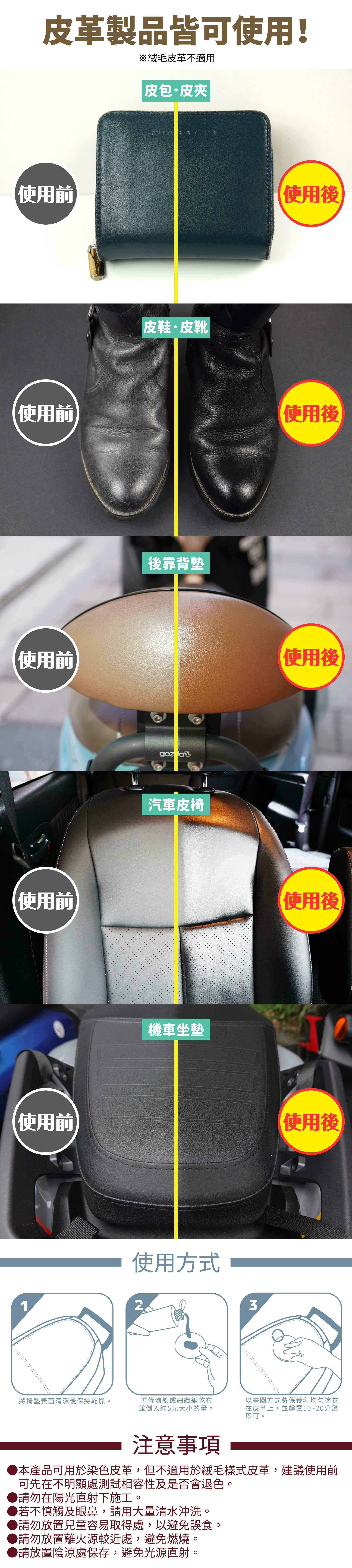 極致皮革保養乳是一款專為皮革製品設計的高效護理產品,能夠深層滋養、保護和修復各類皮革材質,讓皮革保持光澤、柔軟並延長使用壽命。無論是車內座椅、皮包、皮鞋或是家具上的皮革表面,都能夠有效預防乾裂、褪色和污漬,並讓皮革表面恢復自然光澤。這款保養乳含有天然的保濕成分,能深入皮革纖維,防止水分流失,維持皮革的彈性與光滑度。