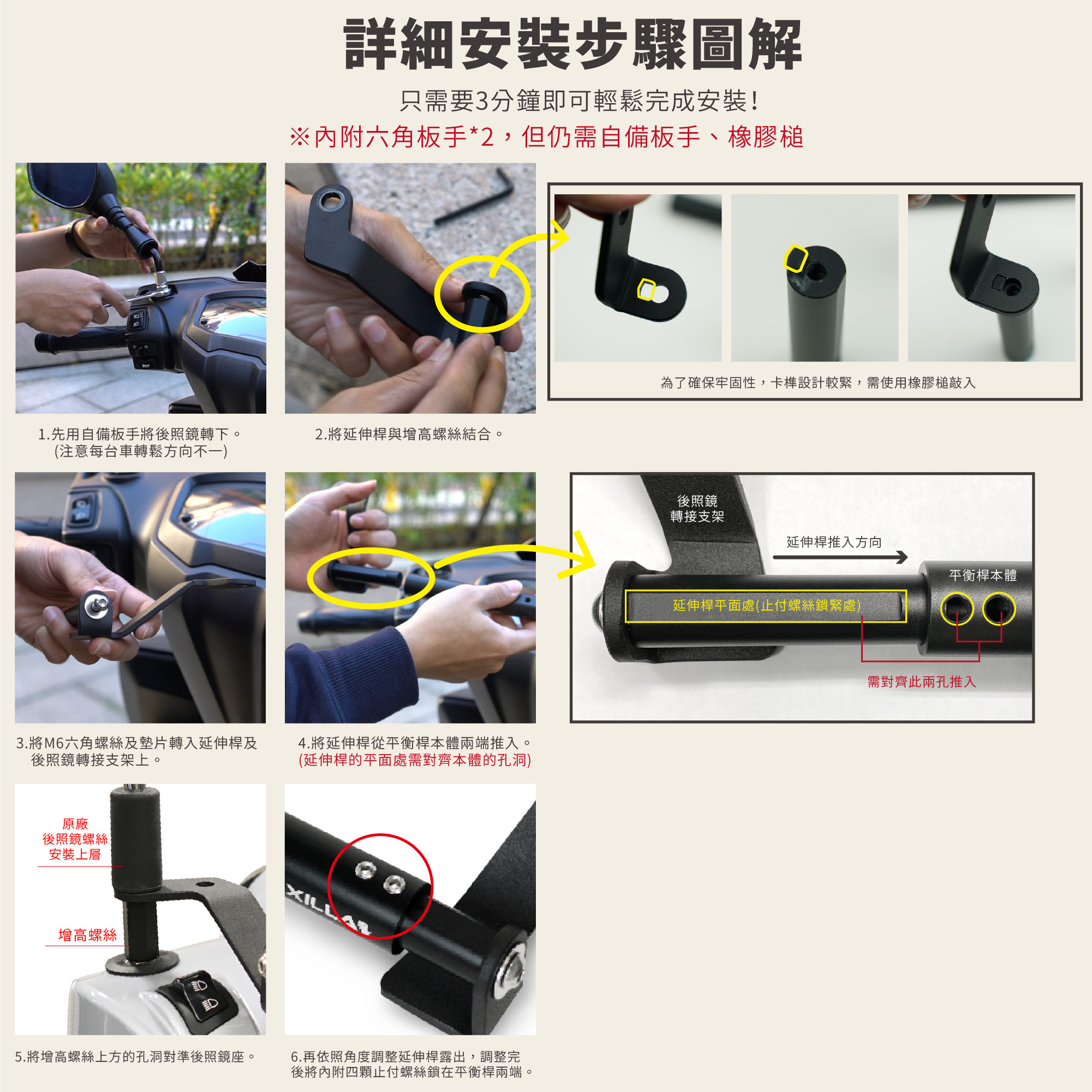 內附兩種六角板手,安裝需自備板手(拆照後鏡用)及橡膠槌
