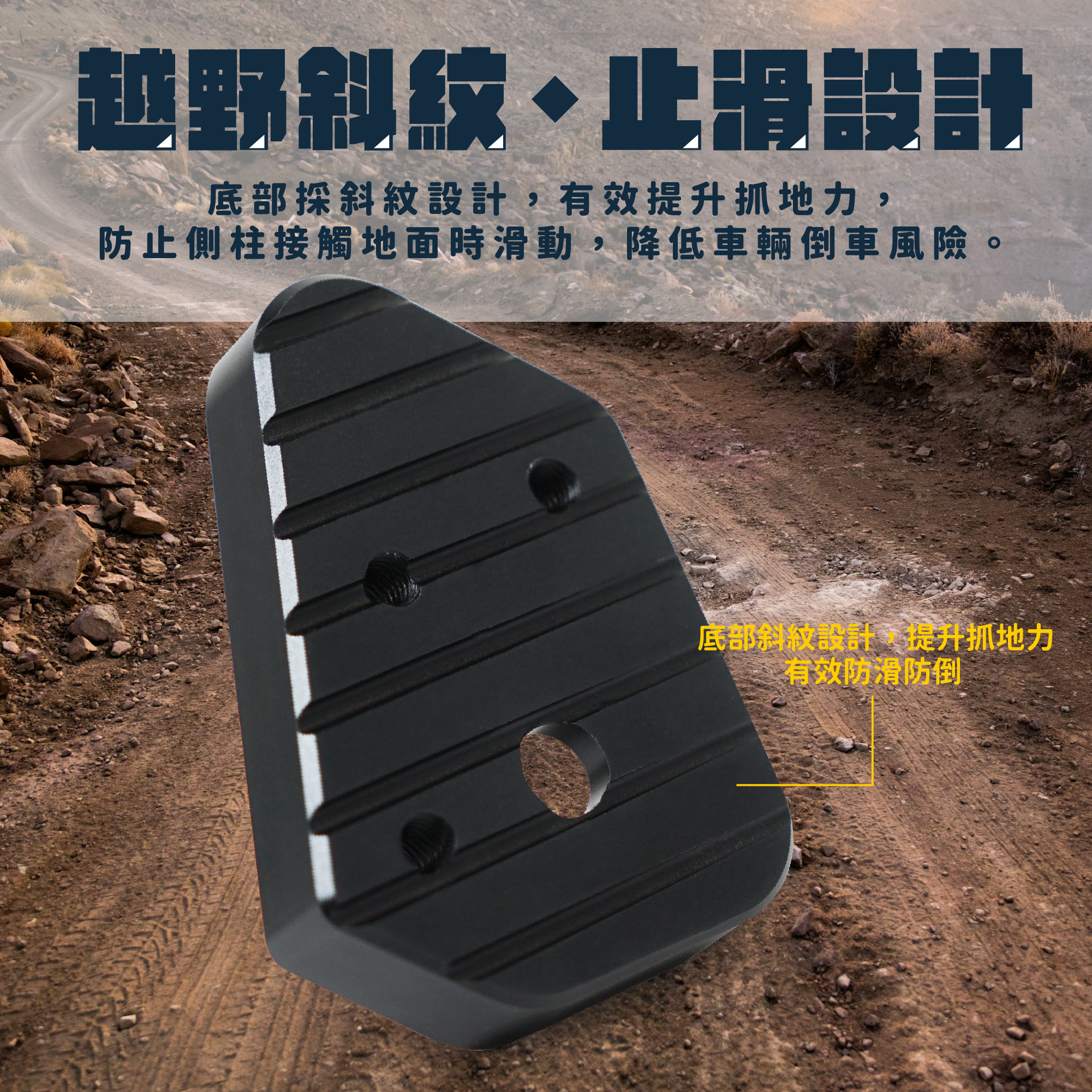 採用高強度鋁合金材質,經陽極氧化處理,防鏽耐蝕不易變形。底部接觸面積加大,有效提升支撐力,停車時車身更穩固,減少因地面凹凸、鬆軟導致側柱陷入或車身傾倒的風險。斜紋止滑設計,強化抓地力,適用多種車款,安裝簡便快速。