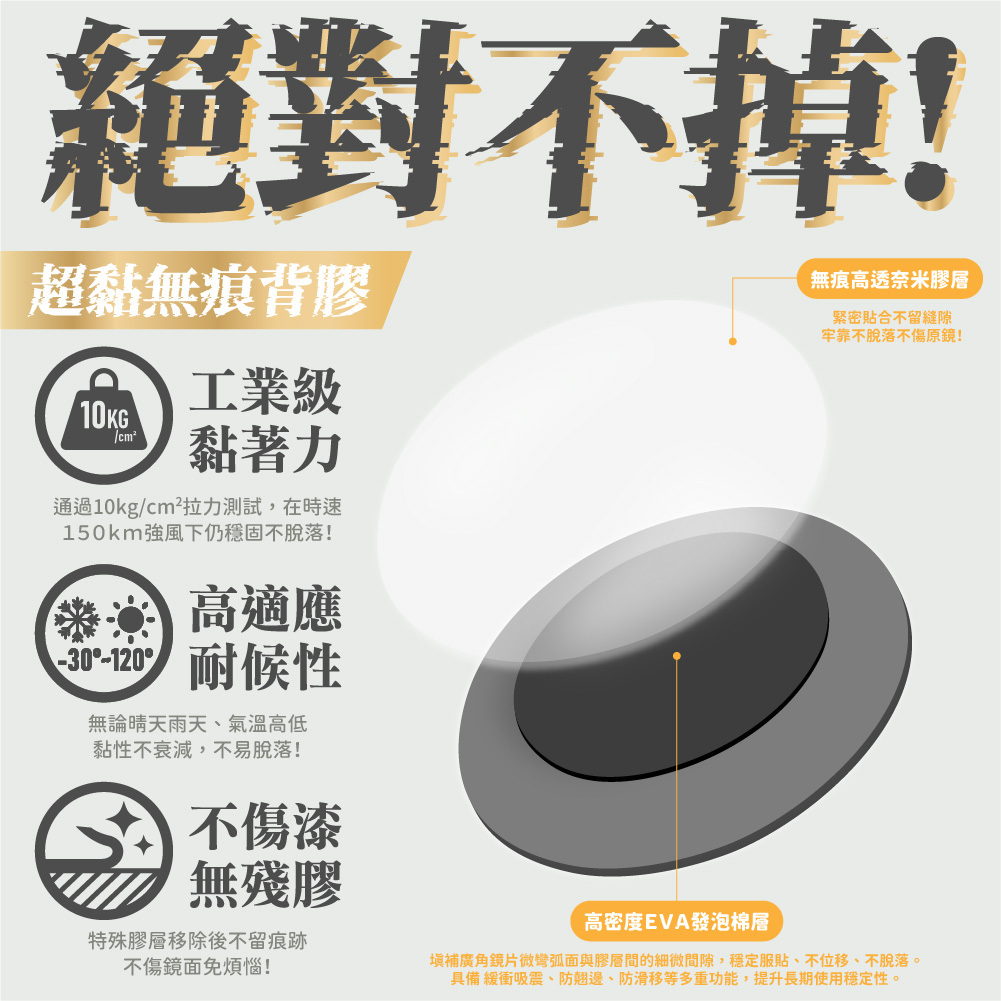 ► 工業級黏著力:通過10kg/cm²拉力測試,時速150km強風下仍支架不支架。