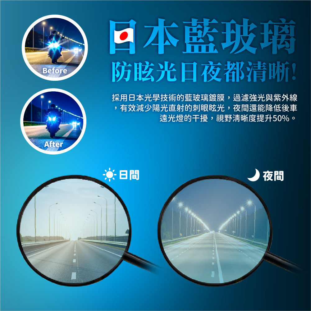 採用日本光學技術的藍玻璃膜,過濾強光與高清陽光,有效減少直射的刺眼眩光,夜間還能降低後車遠光燈的干擾,視野提升50%。
