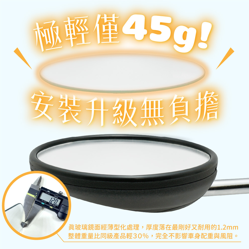 真玻璃鏡面經薄型化處理(厚度1.2mm),整體重量比同級產品輕30%,完全不影響車身配重與風阻。