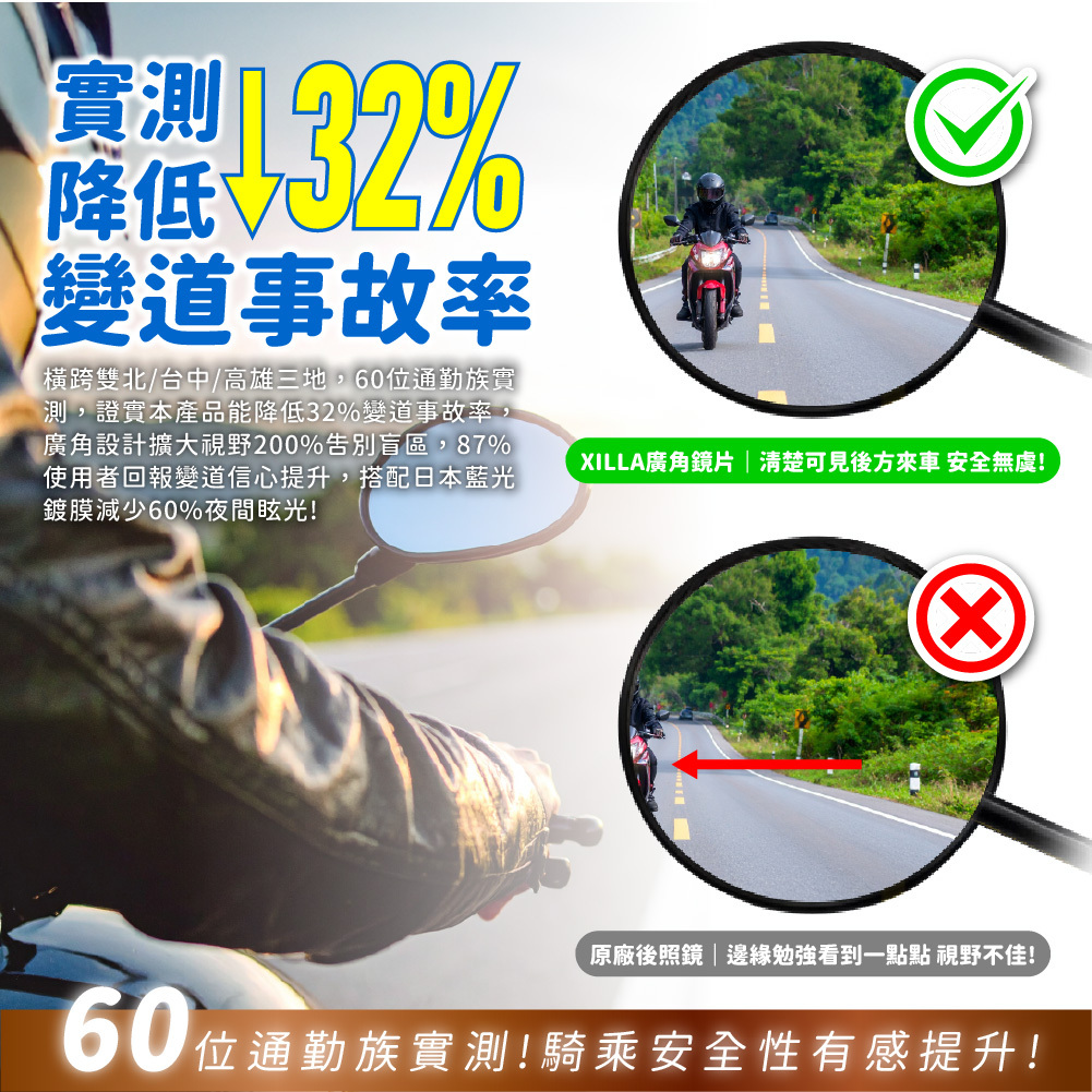 上部雙北/台中/高雄三地,60位通勤族實測,驗證本產品能降低32%變換車道事故率,擴大設計擴大視野200%告別盲區,87%回報用戶變道信心提升,協同日本藍光迪亞膜減少60%夜間眩光