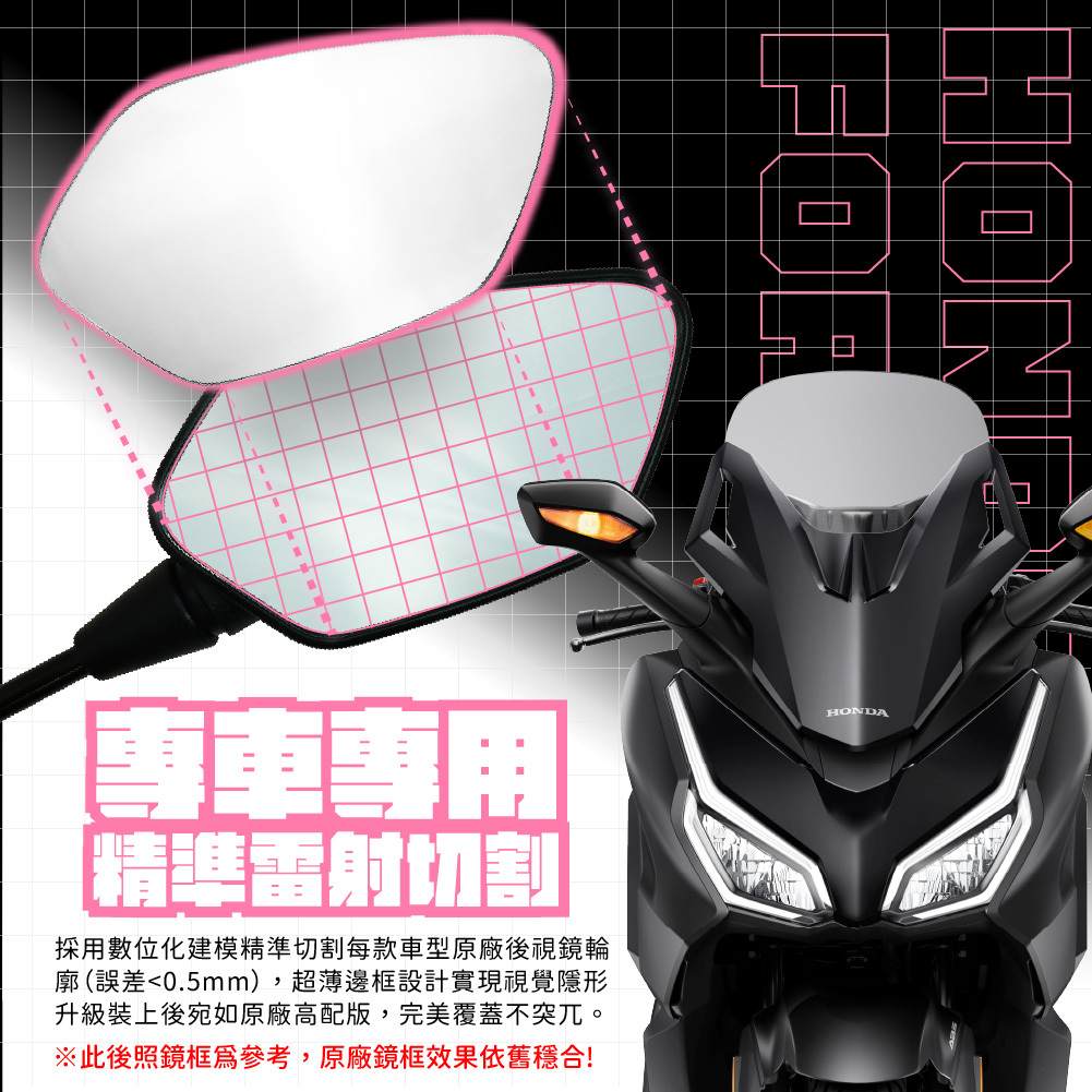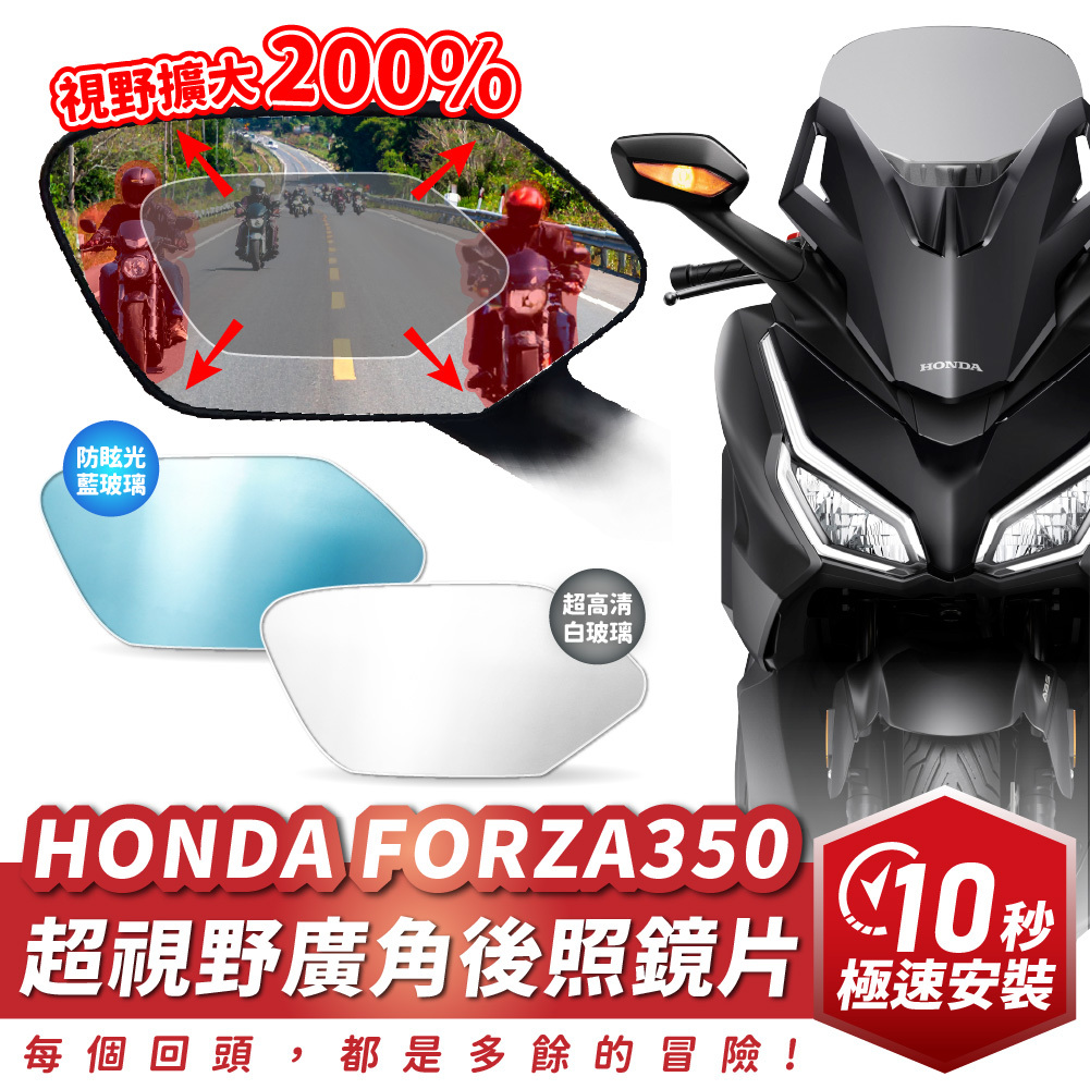 HONDA FORZA350|超視野廣角後照鏡是為FORZA350車主打造的安全升級配件,採廣角曲面鏡片設計,大幅擴展後方視野,有效減少盲區,提高變道、轉彎與路況判斷的安全性。鏡面具備防眩光處理,在強光或夜間燈光照射下可降低刺眼反光,提高觀察清晰度與騎乘舒適度。產品與原廠後照鏡尺寸相容、安裝簡單,不破壞原車外觀,是通勤族與長途騎士提升行車視野與安全的理想選擇。