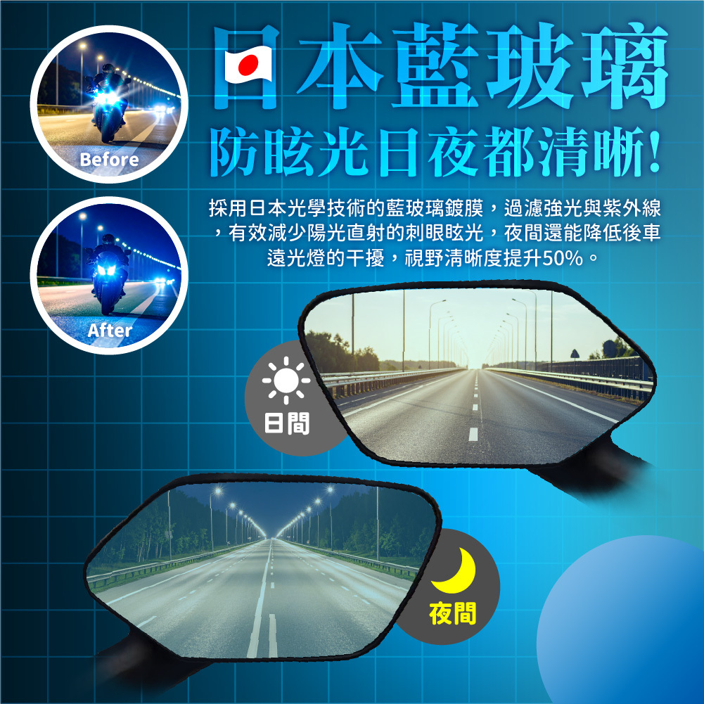 採用日本光學技術的藍玻璃鍍膜,過濾強光與紫外線,有效減少陽光直射的刺眼眩光,夜間還能降低後車遠光燈的干擾,視野清晰度提升50%。