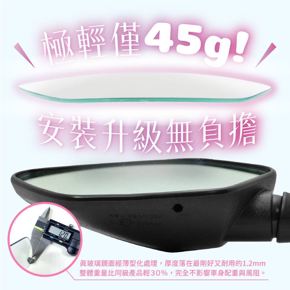 真玻璃鏡面經 薄型化處理(厚度 1.2mm),整體重量比同級產品輕 30%,完全不影響車身配重與風阻。