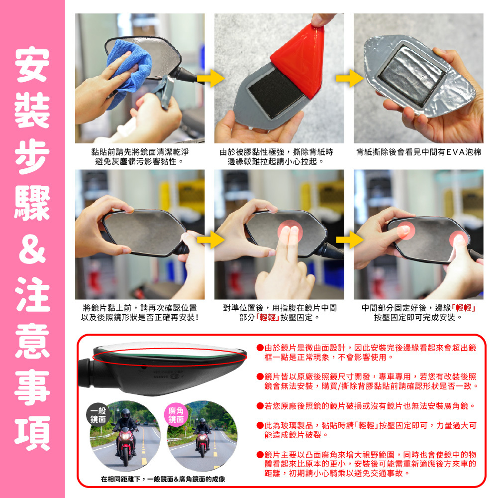 ●鏡片主要以凸面廣角來增大視野範圍,同時也會使鏡中的物體看起來比原本的更小,安裝後可能需重新適應後方來車的距離,初期請小心騎乘以避免交通事故。