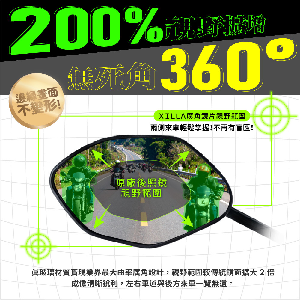 ●鏡片主要以凸面廣角來增大視野範圍,同時也會使鏡中的物體看起來比原本的更小,安裝後可能需重新適應後方來車的距離,初期請小心騎乘以避免交通事故。